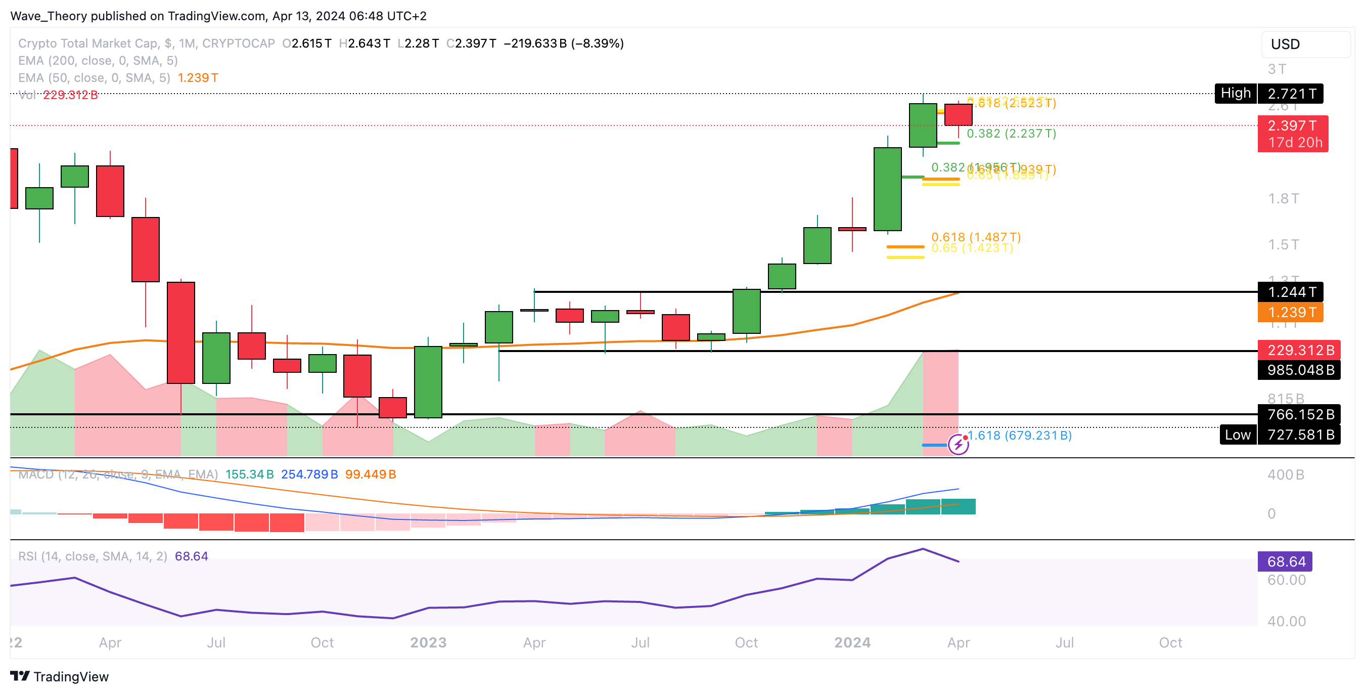 Sollte die 0,382 Fib Unterstützung bei rund 2,237 Billionen USD nicht halten, wartet bei rund 1,95 Billionen USD die nächste signifikante Fibonacci Unterstützung.