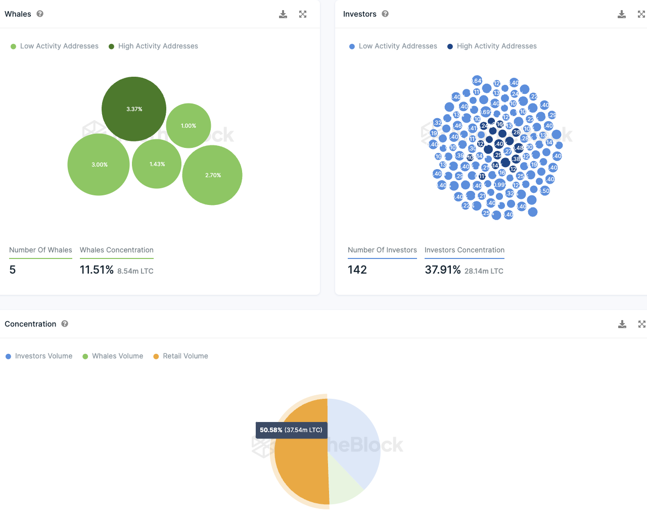 Etwas mehr als die Hälfte aller im Umlauf befindlichen Litecoin Token sind im Besitz von Kleinanlegern. Nur etwa 11,5 % des gesamten Tokenbestands sind in den Händen der sogenannten “Wale” – Adressen, die mehr als 1 % der Token Supply besitzen. Diese “Wale” sind auch nur fünf an der Zahl und ihr Token Anteil ist seit der letzten Analyse um rund 1 % gesunken. Im Vergleich dazu gibt es eine größere Anzahl von Großinvestoren, die zwischen 0,1 % und 1 % der umlaufenden Tokens besitzen. Etwa 142 Großinvestorenadressen halten zusammen rund 38 % der LTC Token.