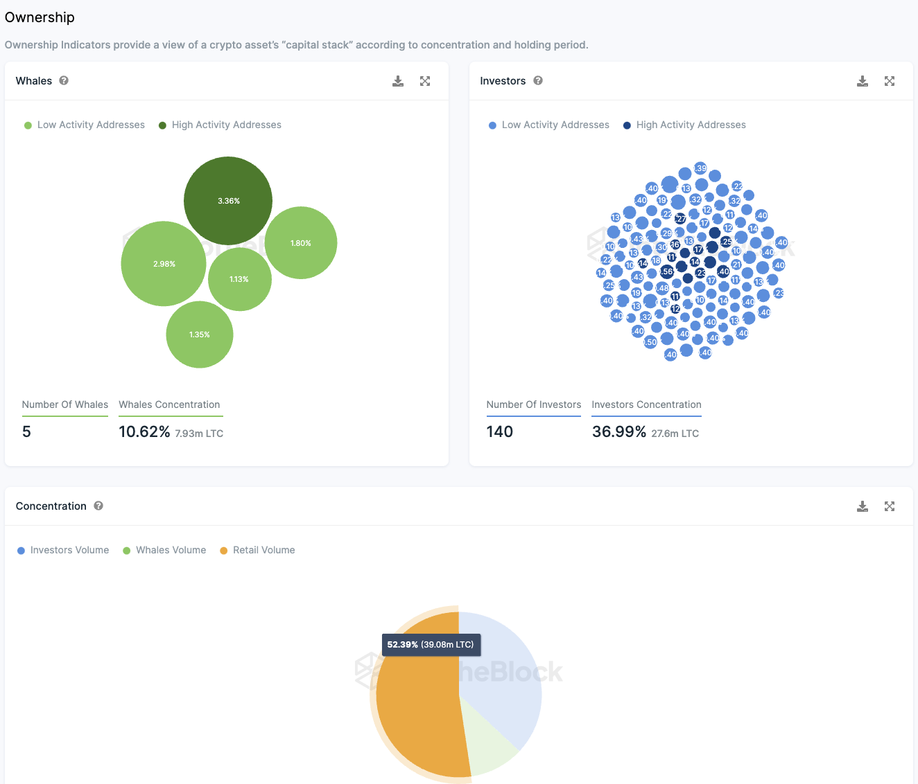 Mehr als die Hälfte (52,4 %) aller Litecoin Token befinden sich im Besitz von Kleinanlegern. Im Gegensatz dazu halten nur fünf “Wal”-Adressen, von denen jede mehr als 1 % des Gesamtvolumens besitzt, zusammen lediglich 10,62 % der Token.