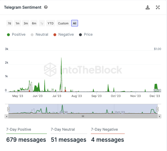 Die Community auf Telegram schreibt dabei fast ausschließlich positive Nachrichten zu PEPE. So lagen in den letzten sieben Tagen 679 positive Nachrichten und nur vier negative Nachrichten vor.