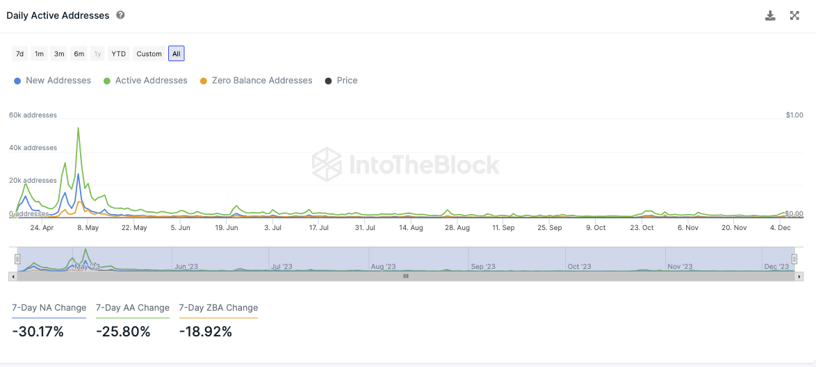 Die Netzwerkaktivität ist in den letzten sieben Tagen dennoch stark gesunken. So ist die Anzahl an neuen Adressen um rund 30 % zurückgegangen, wohingegen die Anzahl an aktiven Adressen um rund 26 % gefallen ist. Die Menge an Adressen, die kein PEPE Guthaben aufweisen, ist dabei um knapp 19 % gesunken.