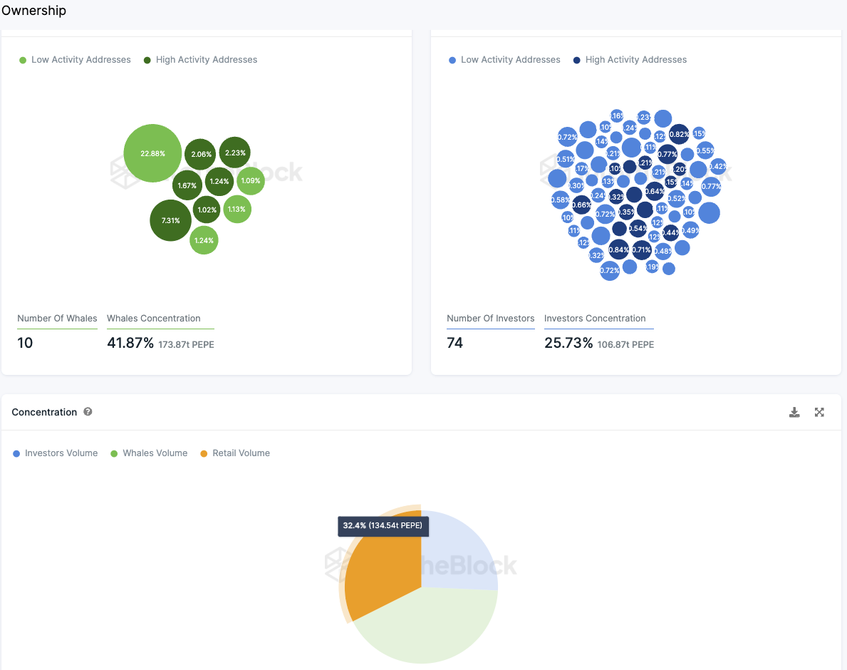PEPE wird dabei vor allem von Walen gehalten. Zehn Wal-Adressen, die jeweils mehr als 1 % der Token Supply halten, halten zusammen rund 42 % der gesamten Token Supply. Sechs Adressen davon sind sogar Adressen mit sehr hoher Aktivität.
