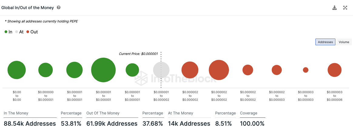 Die On-Chain Daten von IntoTheBlock geben interessante Einblicke in den Pepe Coin (PEPE). So befinden sich tatsächlich mehr als die Hälfte der Adressen im Plus.