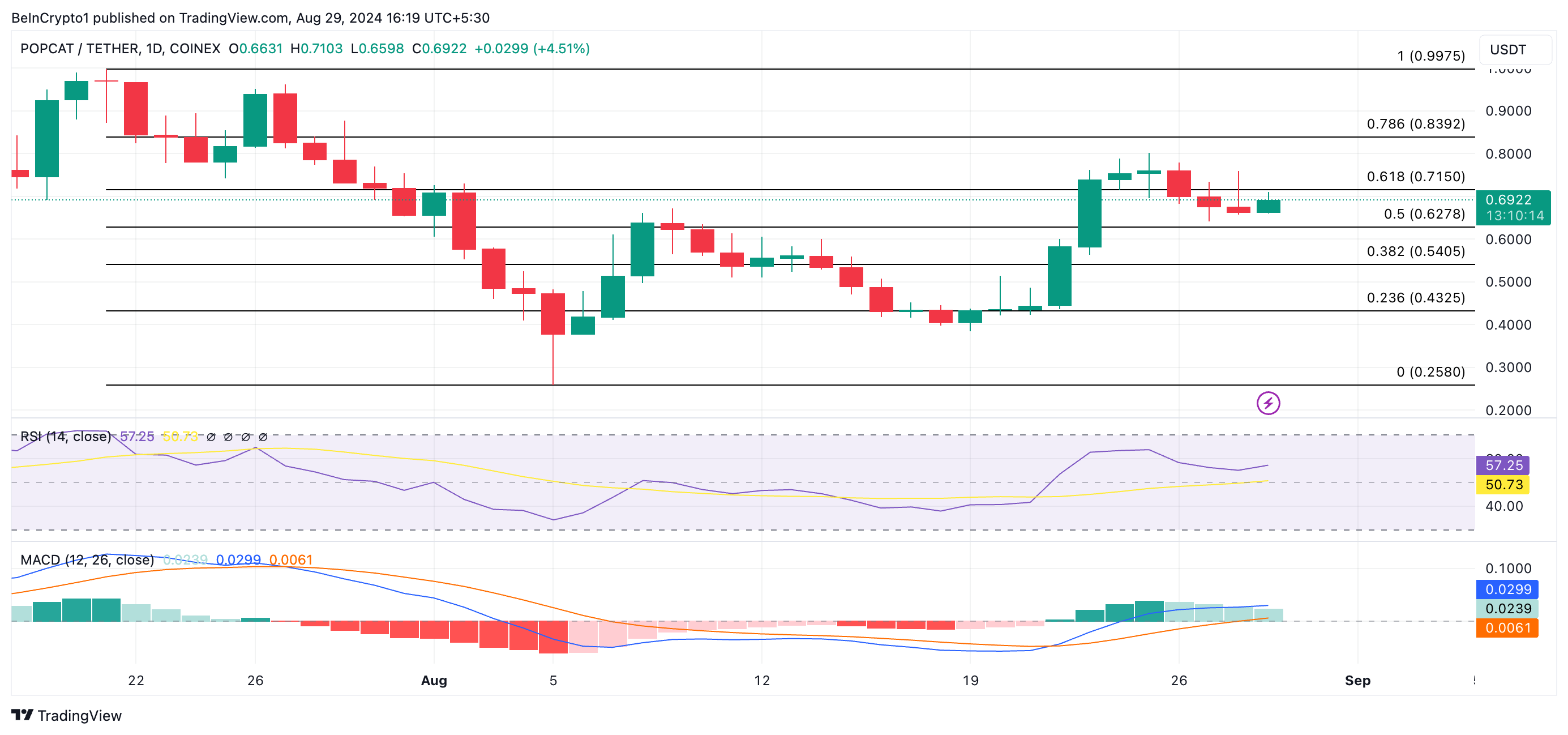 Wenn dieser Trend anhält, könnte der Kurs von POPCAT auf 0,71 USD steigen. Sollte jedoch eine Umkehr eintreten, könnte der Kurs auf 0,62 USD fallen.