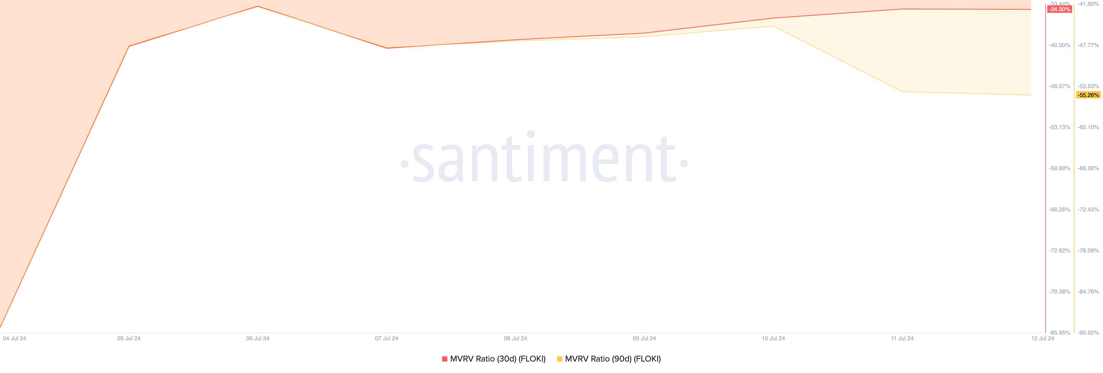 Eine On-Chain-Bewertung des Market Value to Realized Value (MVRV)-Verhältnisses von Floki zeigt, dass der Indikator ein Kaufsignal sendet. Laut Daten von Santiment liegen die 30-Tage- und 90-Tage-MVRV-Verhältnisse von FLOKI bei -34,30 Prozent und -55,26 Prozent.