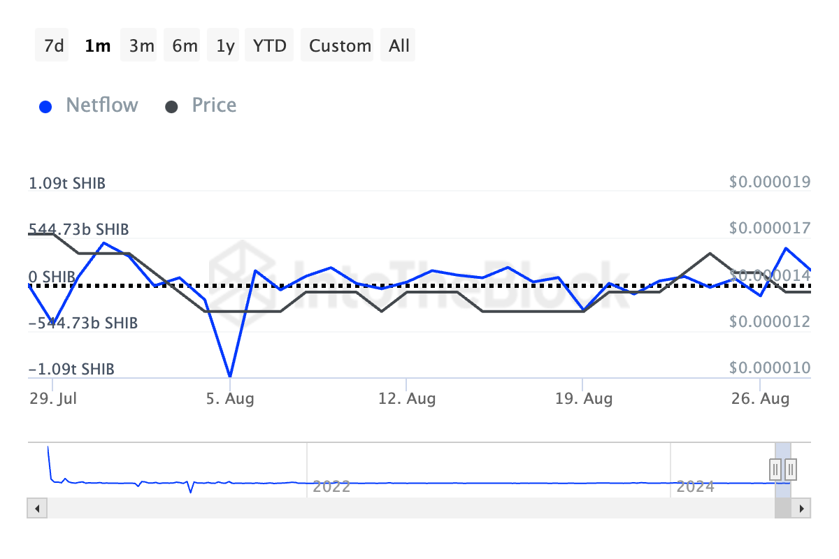 Trotz des zweistelligen Kursrückgangs von SHIB im letzten Monat haben Wale mehr Coins angesammelt, wie ein Anstieg von 81 Prozent im Nettofluss großer Halter zeigt.