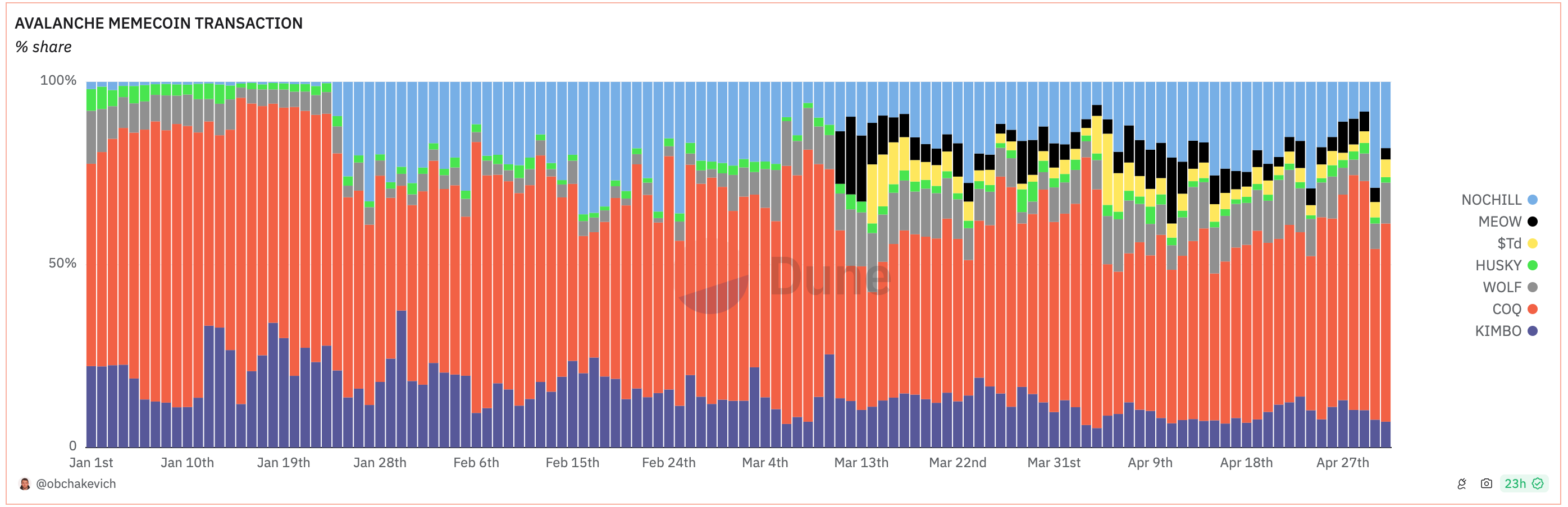“Die Memecoins auf Avax entwickeln sich gut. Wenn man sich März und April ansieht, überstieg die Anzahl der Transaktionen 10k. COQ, NOCHILL und KIMBO hatten die besten Ergebnisse.”