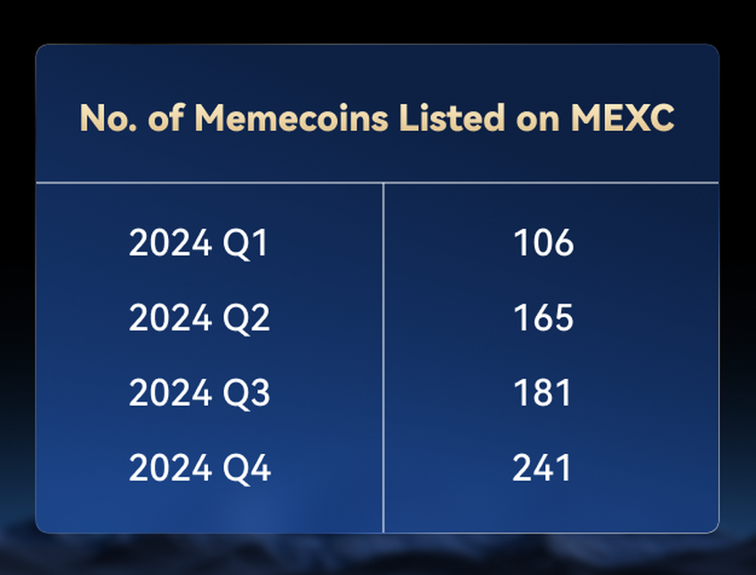MEXC zeigte im 4. Quartal 2024 eine starke Marktführerschaft, indem es sich strategisch auf den Memecoin-Sektor konzentrierte und erfolgreich mehr als 240 hochwertige Meme-Projekte auf seiner Plattform einführte. Die sorgfältige Projektauswahl der Börse erwies sich als äußerst erfolgreich, da die Top 5 der neu gelisteten Memecoins im Jahr 2024 bemerkenswerte Ergebnisse erzielten – ihre Preise erreichten im Durchschnitt einen Höchstgewinn von über 8.700 %, während herausragende Projekte wie KEKIUS und FWOG Gewinne von über 10.000 % verzeichneten. Auch die Marktkapitalisierungsmetriken waren beeindruckend: Die Top 5 Memecoins erzielten durchschnittliche Höchstgewinne von über 3.500 %, angeführt von PNUT, das einen außergewöhnlichen maximalen Gewinn von mehr als 7.000 % erreichte.