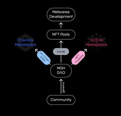 Unter Verwendung der Chainlink-Infrastruktur wird der Algorithmus mit einem Orakel verbunden, sodass die Daten an jede Art von Smart Contract weitergeleitet werden können, die bereit ist, mit ihm zu interagieren. In diesem Sinne wird die MGH DAO eines der ersten Projekte sein, das KI-basierte NFT-Bewertungen anbietet und damit einen der Hauptprobleme von MetaFi löst – die Konvergenz von DeFi und dem Metaverse. Der Algorithmus wird zunächst Parzellen und Ländereien aus virtuellen Welten wie der Sandbox und Decentraland bewerten, und er wird nach und nach erweitert, um alle Arten von NFTs wie Kunstsammlungen und In-Game-Vermögenswerte zu bewerten, wodurch eine zugrundeliegende Finanzierungsebene geschaffen wird, die dazu beiträgt, eine gemeinsame wirtschaftliche Basis zwischen allen Sektoren innerhalb des Metaverse zu schaffen.