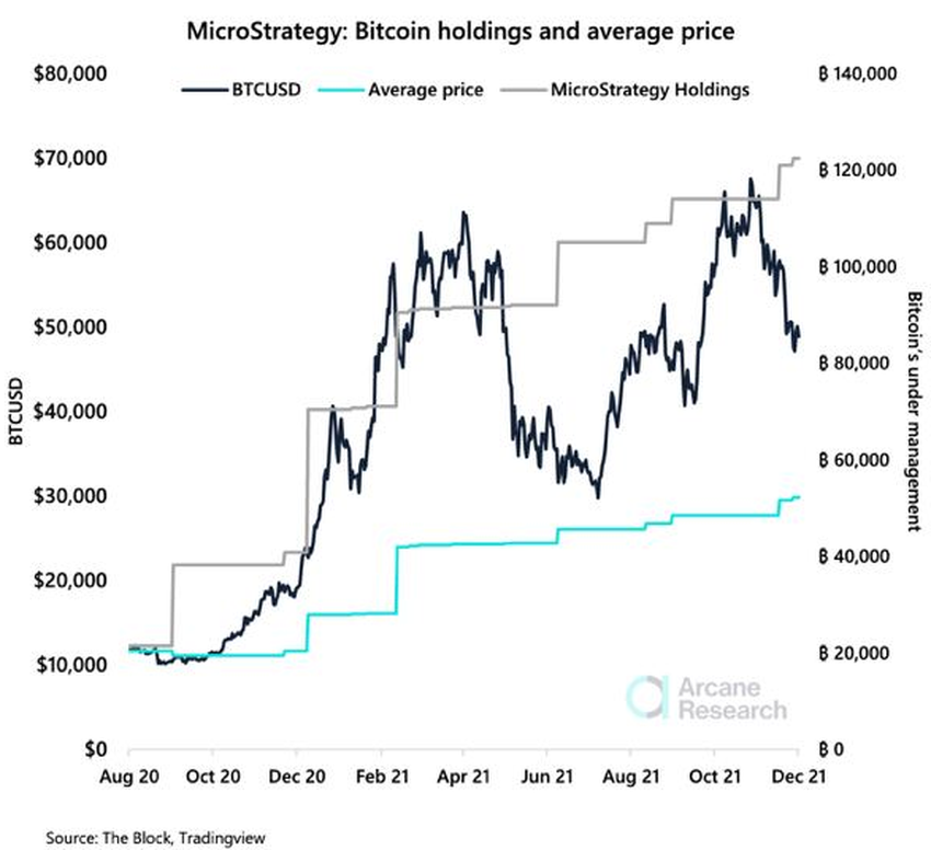 Dem Chart von Arcane Research ist zu entnehmen, dass MicroStrategy durch das Bitcoin-Investment zu niedrigen Kursen einen Durchschnittspreis von 29.860 US-Dollar erzielte.