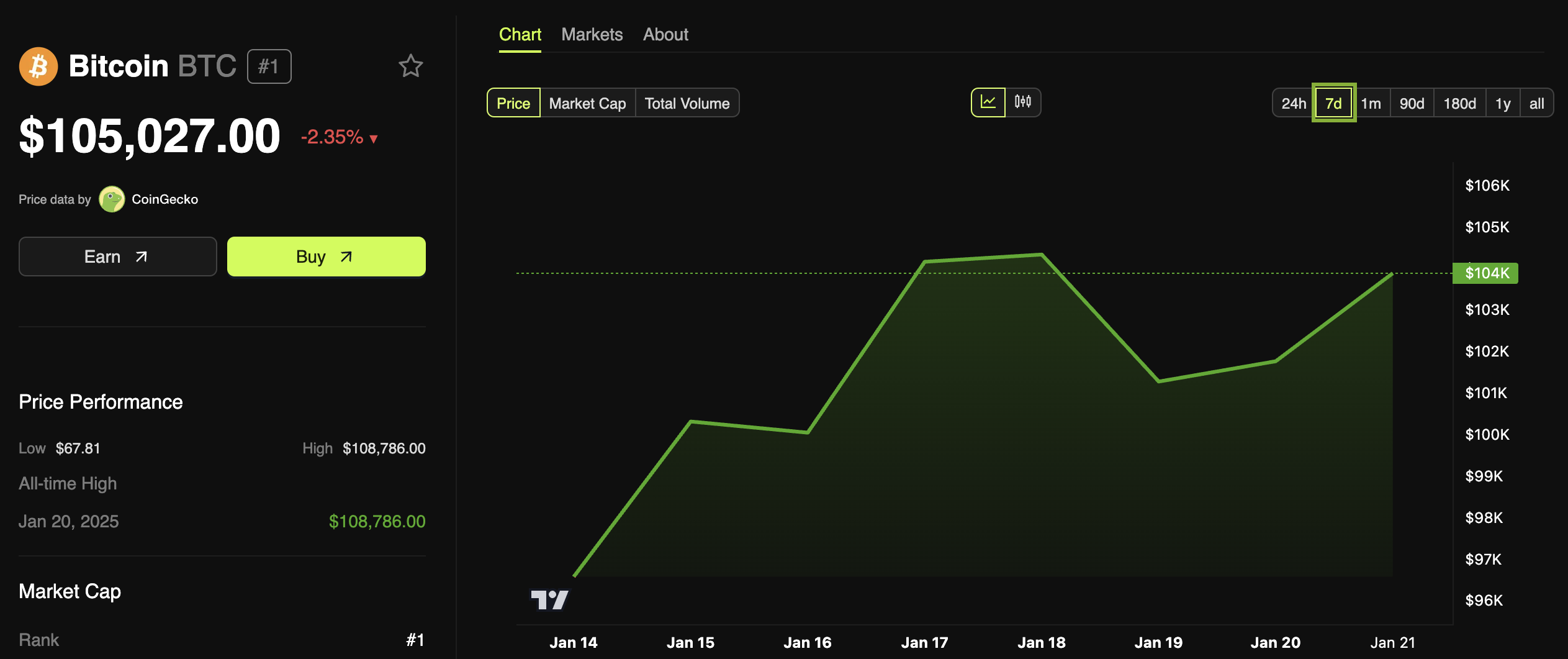 “MicroStrategy hat 11.000 BTC für ~1,1 Milliarden USD zu ~101.191 USD pro Bitcoin erworben und hat eine BTC-Rendite von 1,69 % YTD 2025 erreicht. Zum 20.1.2025 halten wir 461.000 BTC, die für ~29,3 Milliarden USD zu ~63.610 USD pro BTC erworben wurden”, sagte Saylor.