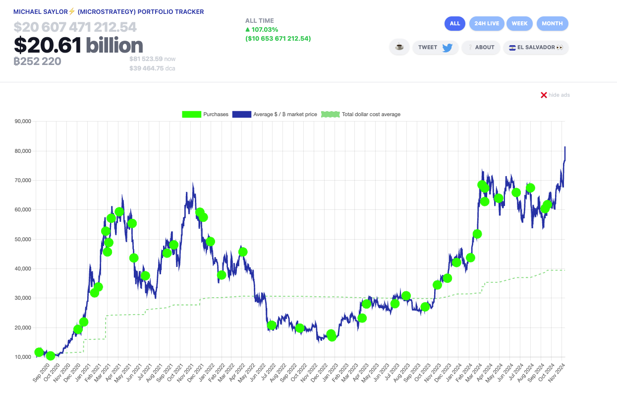 Das BTC-Portfolio des Unternehmens ist bereits auf bemerkenswerte 20,6 Milliarden USD angestiegen. Die Website Saylor Tracker verfolgt diesen Wert in Echtzeit.