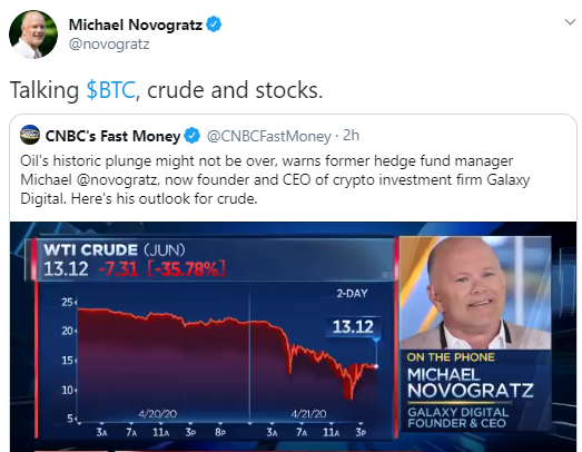 Der Einbruch des Ölpreises in dieser Woche, bei dem der Preis bis auf bis zu minus $40 pro Barrel fiel, hat seine Bedeutung als Wertaufbewahrungsmittel geschwächt und Bitcoin eine weitere Chance gegeben, um zu glänzen. Offenbar hat Novogratz, ehemaliger Makro-Hedgefonds-Manager bei der Fortress Investment Group, diese Marktdynamik schon einmal erlebt.