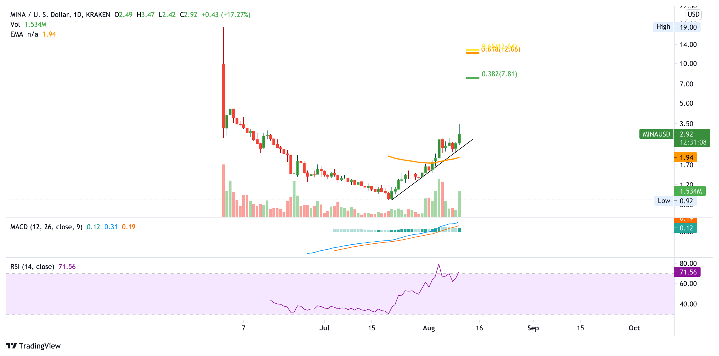 Mina fand seinen Tiefpunkt bei 0,92 USD Mitte Juli. Seither befindet sich Mina in einem stetigen Aufwärtstrend. Aktuell befindet sich Mina an einem horizontalen Widerstand bei rund 3 USD, und sollte dieser gebrochen werden, könnte Mina bis rund 5 USD steigen, wo der letzte, signifikante Widerstand auf Mina wartet, bevor der Mina Preis 7,8 USD erreichen könnte.