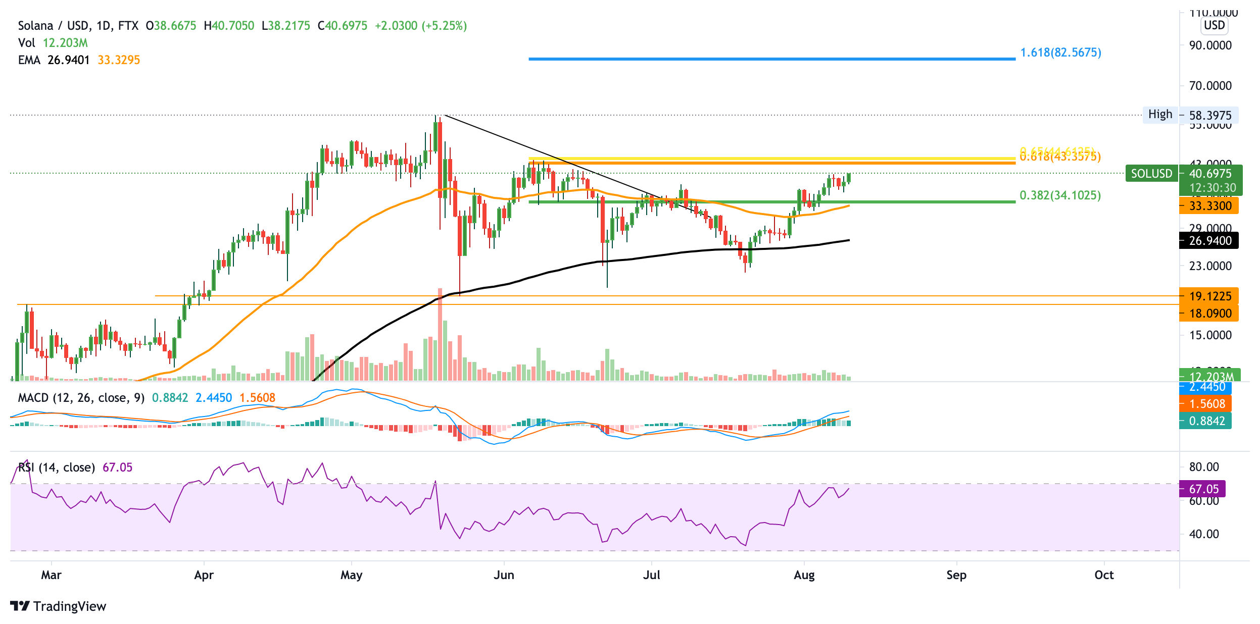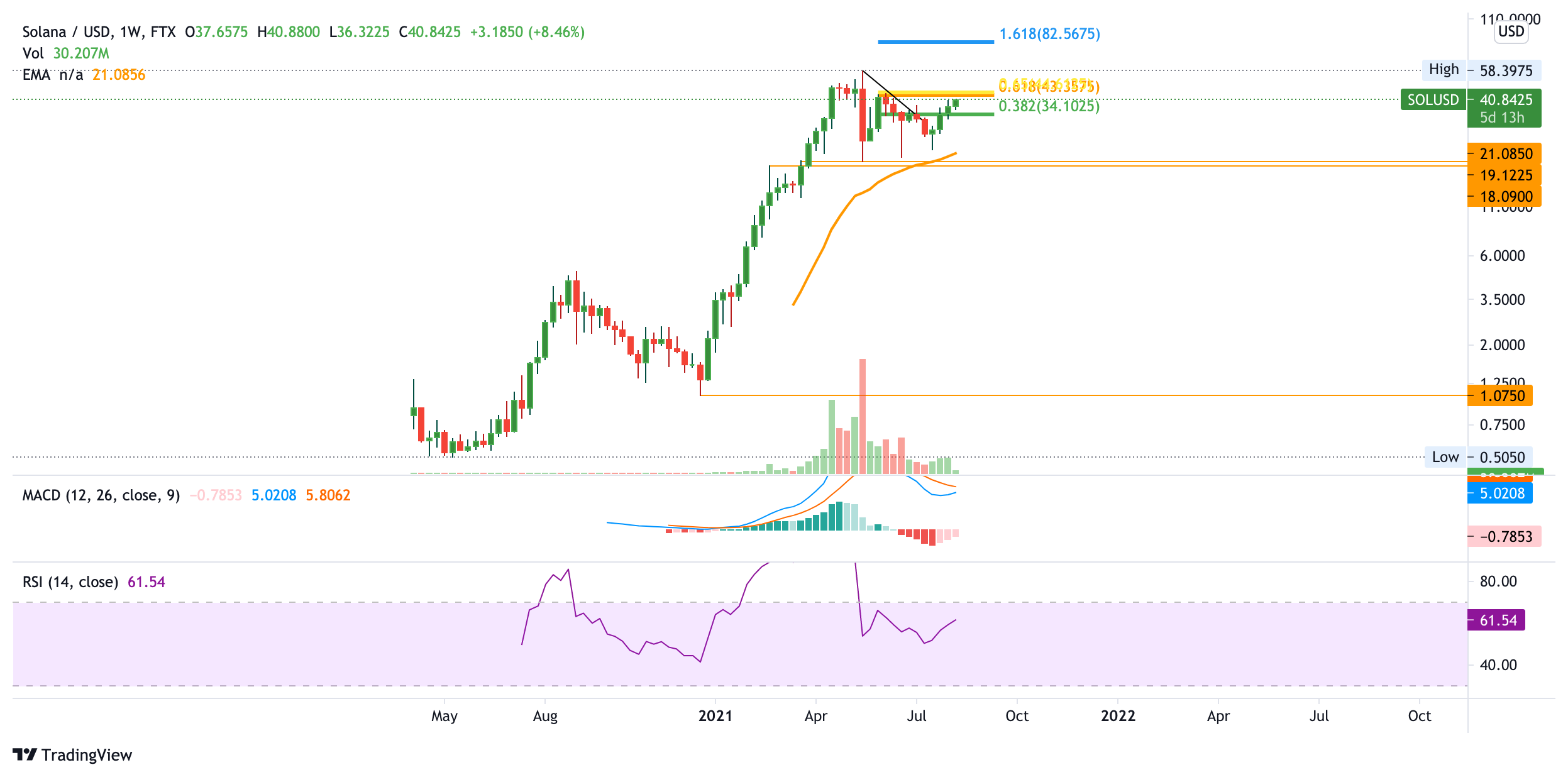 Unterstützung findet der Solana Kurs zwischen 18 USD – 21 USD, denn dort wartet auf den Solana Kurs der 50-Wochen-EMA und horizontale Unterstützung. Aktuell scheint sich der MACD im Wochenkurs ebenfalls wieder bullischer zu entwickeln. Sollte der Solana Kurs also durch 44 USD brechen, sieht es sehr gut aus für den Solana Kurs.