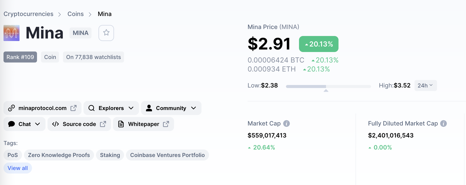 Mina setzt auf Effizienz: die gesamte Blockchain ist nur 22KB groß. Anstatt auf Rechenkraft zu setzen, verbindet Mina Kryptographie mit rekursiven zk-SNARKs, wodurch die Blockgröße derart verringert wird. Zudem nutzt Mina einen modifizierten Proof-of-Stake Mechanismus (Ouroboros), wodurch alle Teilnehmer der Mina Blockchain als vollwertige Knoten agieren und jeder am Konsens beteiligt wird. Sollte sich die Technologie also ähnlich durchsetzen wie Solanas Blockchain, dann könnte Mina Solana in der Marktkapitalisierung aufholen. Aktuell entspricht die Marktkapitalisierung von Mina nur rund 5 % der Marktkapitalisierung Solanas. Daran gemessen, könnte Mina sich also im Kurs mehr als verzwanzigfachen, um auf einen Kurs von 58,2 $ zu klettern.
