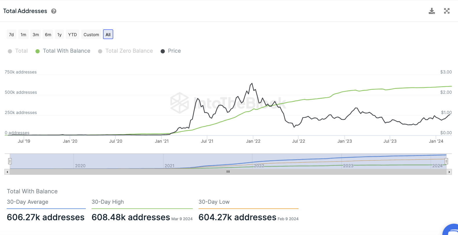 Das Polygon Netzwerk befindet sich weiterhin im Wachstum. So wurden in den letzten 30 Tagen rund 606.000 Polygon Adressen gezählt, die ein MATIC Guthaben aufweisen.