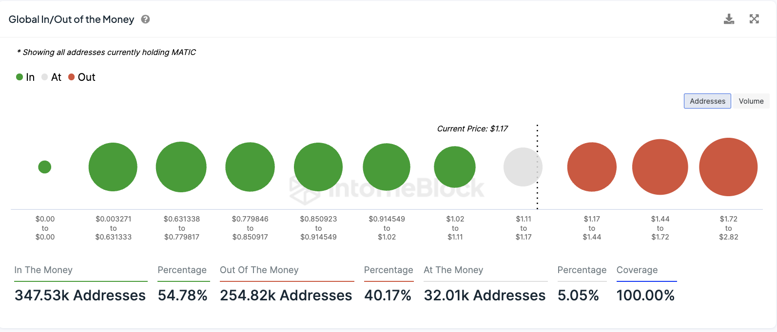 Die Anzahl an Adressen im roten Bereich ist von rund 54,2 % auf rund 40,2 % gesunken. Das bedeutet, diese Adressen würden einen Verlust erleiden, wenn sie ihre Polygon Token zum aktuellen Kurs verkaufen würden.