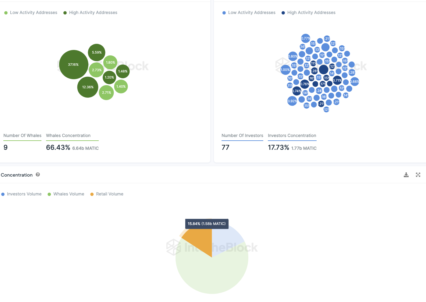 Die Konzentration der MATIC Token ist sehr zentralisiert. So halten lediglich neun Adressen über zwei Drittel (66,43 %) der zirkulierenden Token Menge. Jede dieser Wal Adressen besitzt mehr als 1 % des gesamten Tokenvorrats.