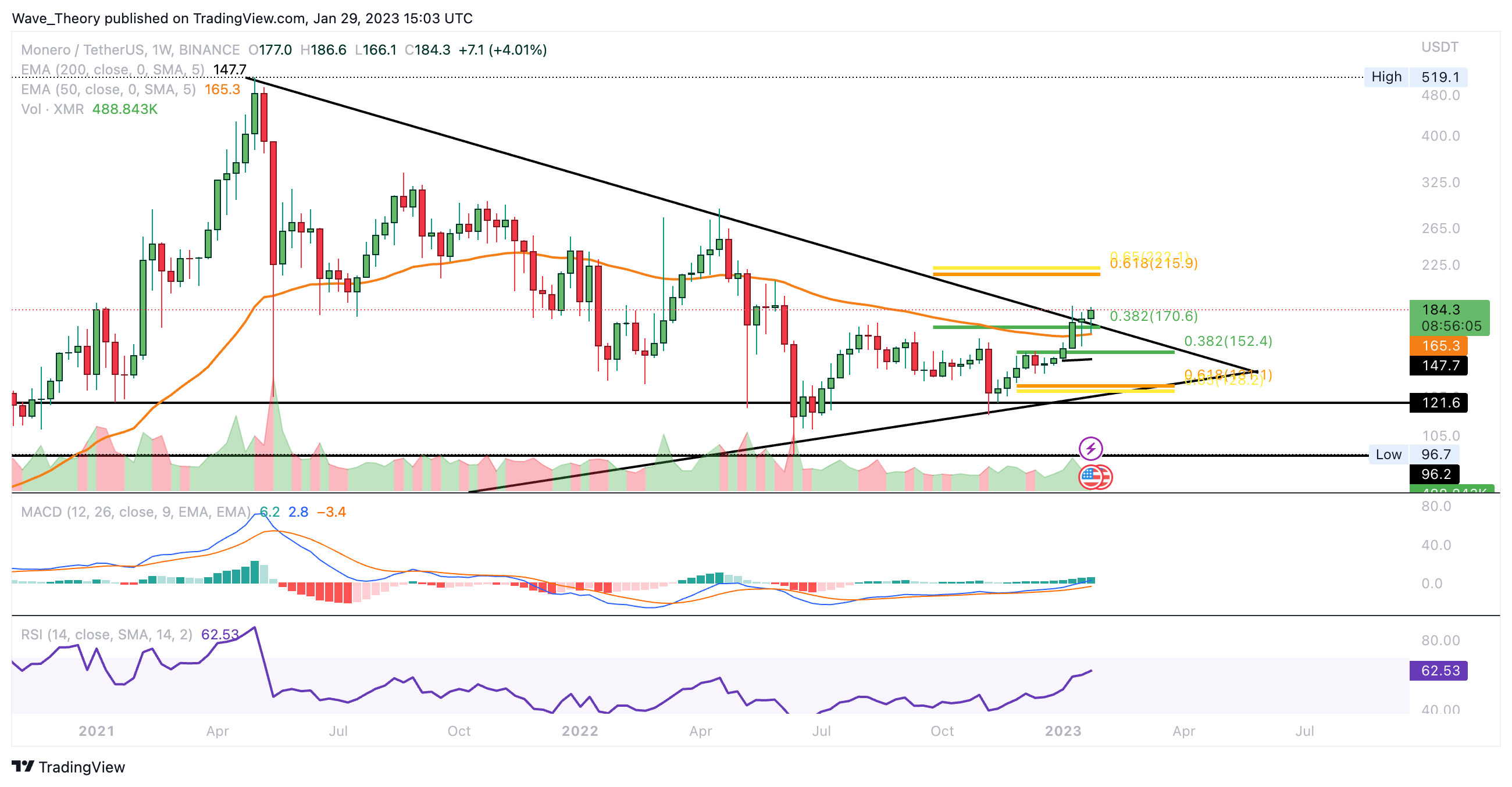 Der XMR Kurs konnte dabei sowohl den 50-Wochen-EMA bei rund 165 USD als auch das 0,382 Fib Niveau bei rund 170,6 USD bereits überwinden. Damit liegt das nächste Kursziel bei rund 220 USD. Sollte die Wochenkerze über der oberen Trendlinie des symmetrischen Dreiecks schließen, erfolgt damit ein bullischer Ausbruch.