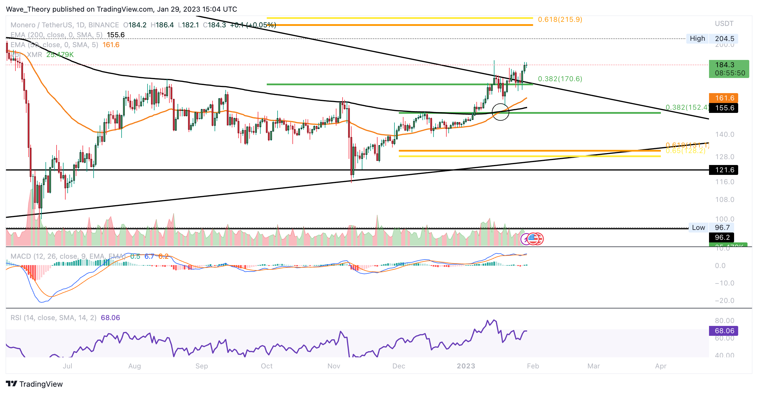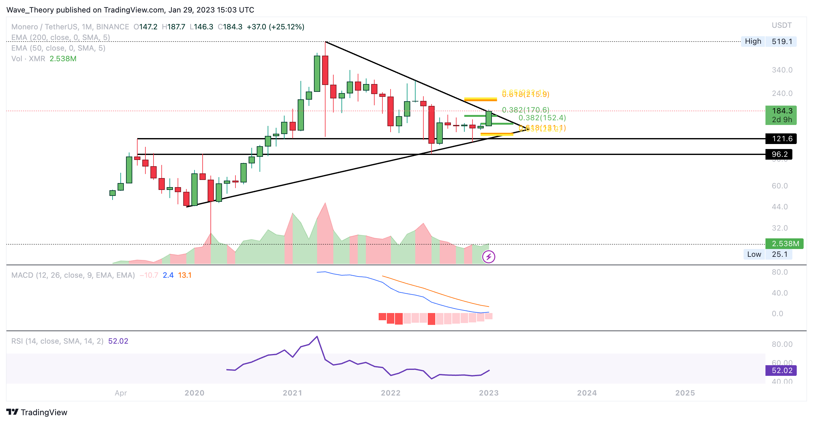 Der XMR Kurs konnte in diesem Monat über 28 % steigen, womit der XMR Kurs kurz vor einem bullischen Ausbruch aus dem symmetrischen Dreiecksmuster steht. Dann könnte XMR den nächsten Golden Ratio Widerstand bei rund 220 USD anvisieren.