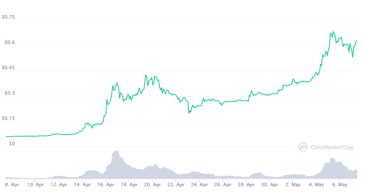 Am 5. Mai 2021 erreichte der Dogecoin Preis ein Allzeithoch von 0,67 US-Dollar. Seitdem hat der Coin etwas an Momentum verloren, seit dem 7. Mai 2021 geht es aber wieder leicht aufwärts. Zum Zeitpunkt des Verfassens des Artikels liegt der Dogecoin Preis bei 0,62 US-Dollar.