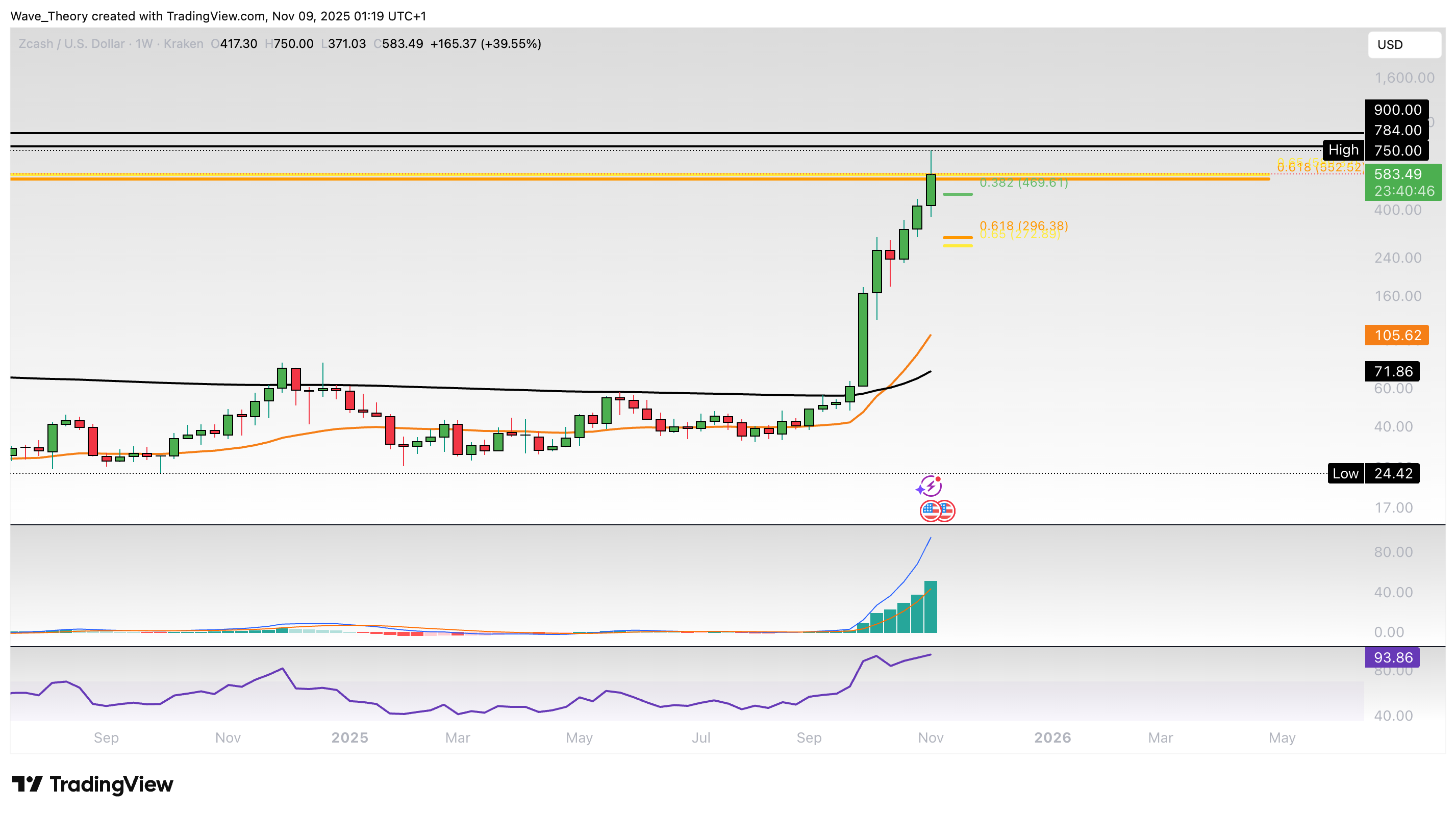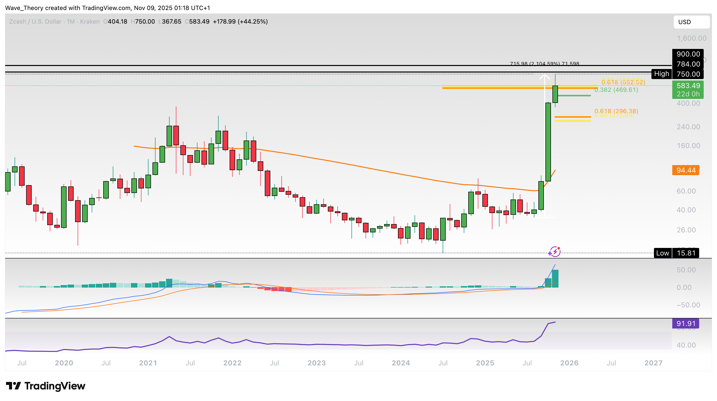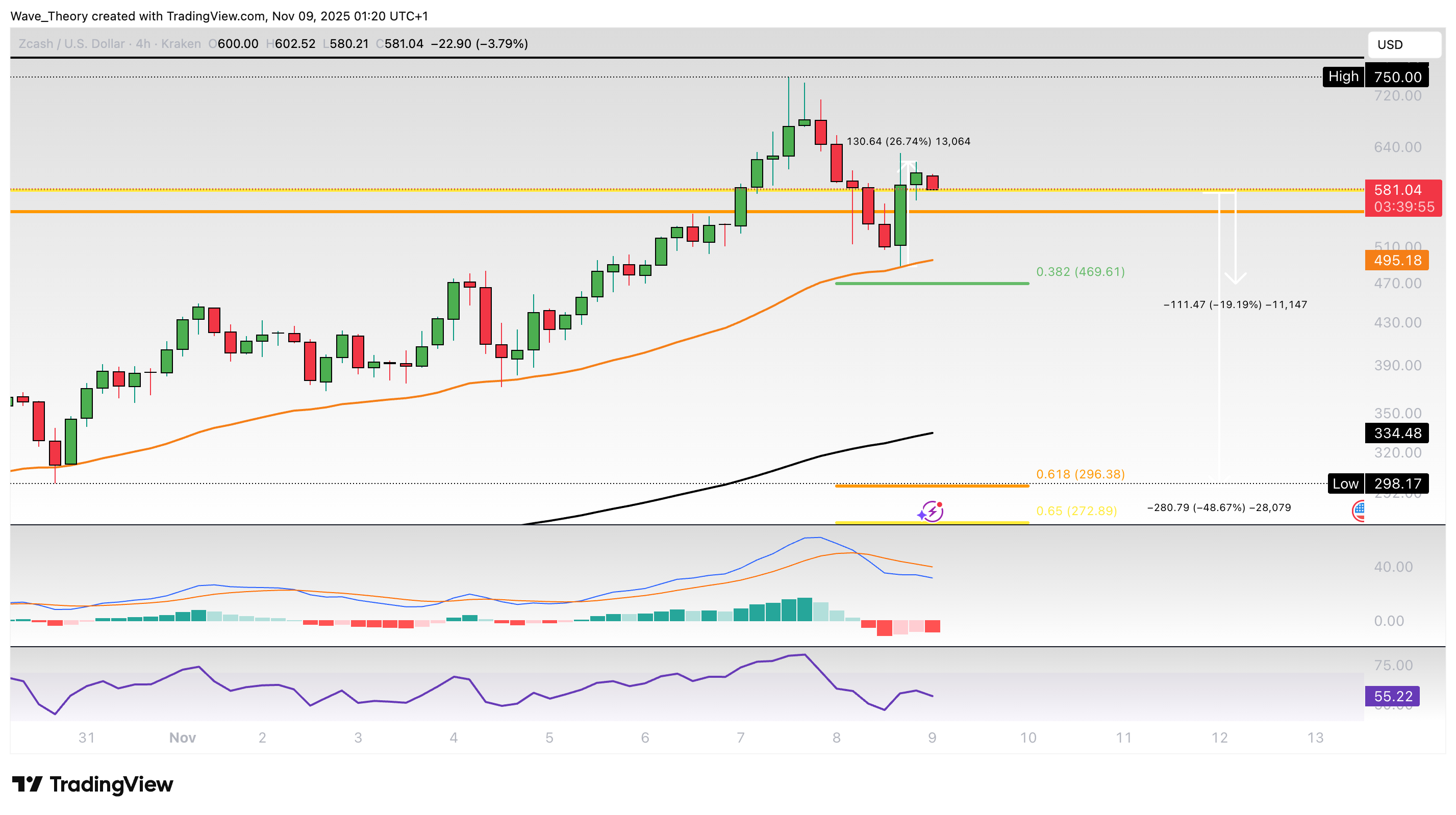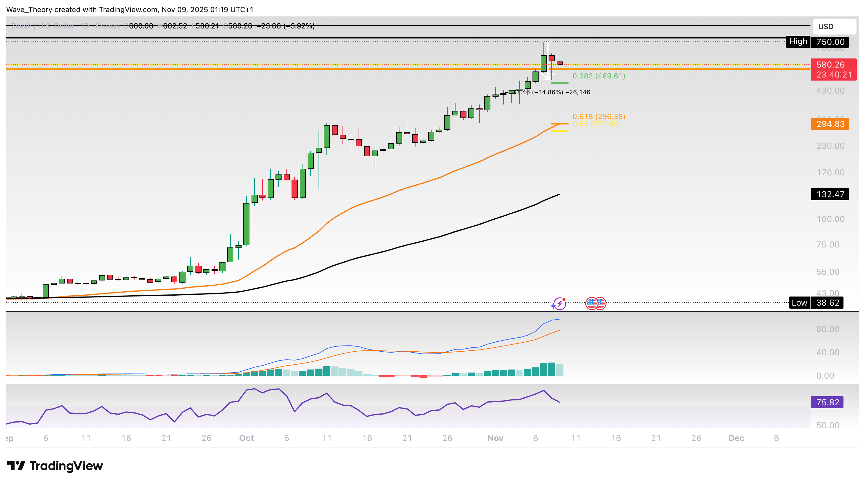Zcash Prognose für Sonntag, 09. November 2025: Der Zcash Kurs hat 22X hingelegt und dabei ein Hoch bei rund 750 USD erreicht. Doch jetzt korrigiert er.