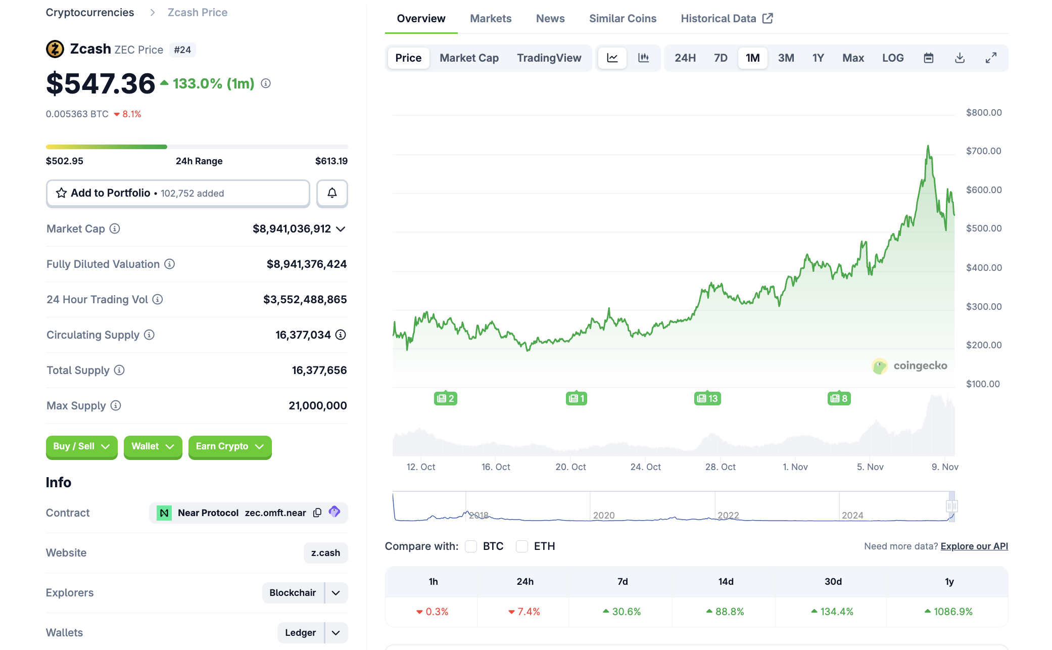 Zcash weist eine Marktkapitalisierung von 9 Milliarden USD auf