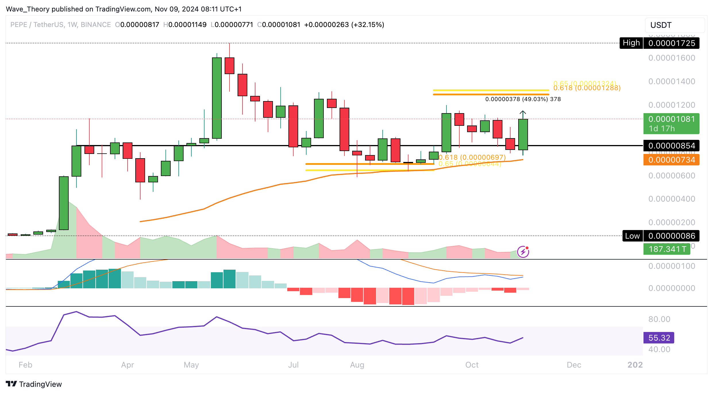 Der PEPE Kurs konnte in dieser Woche rund 49 % steigen