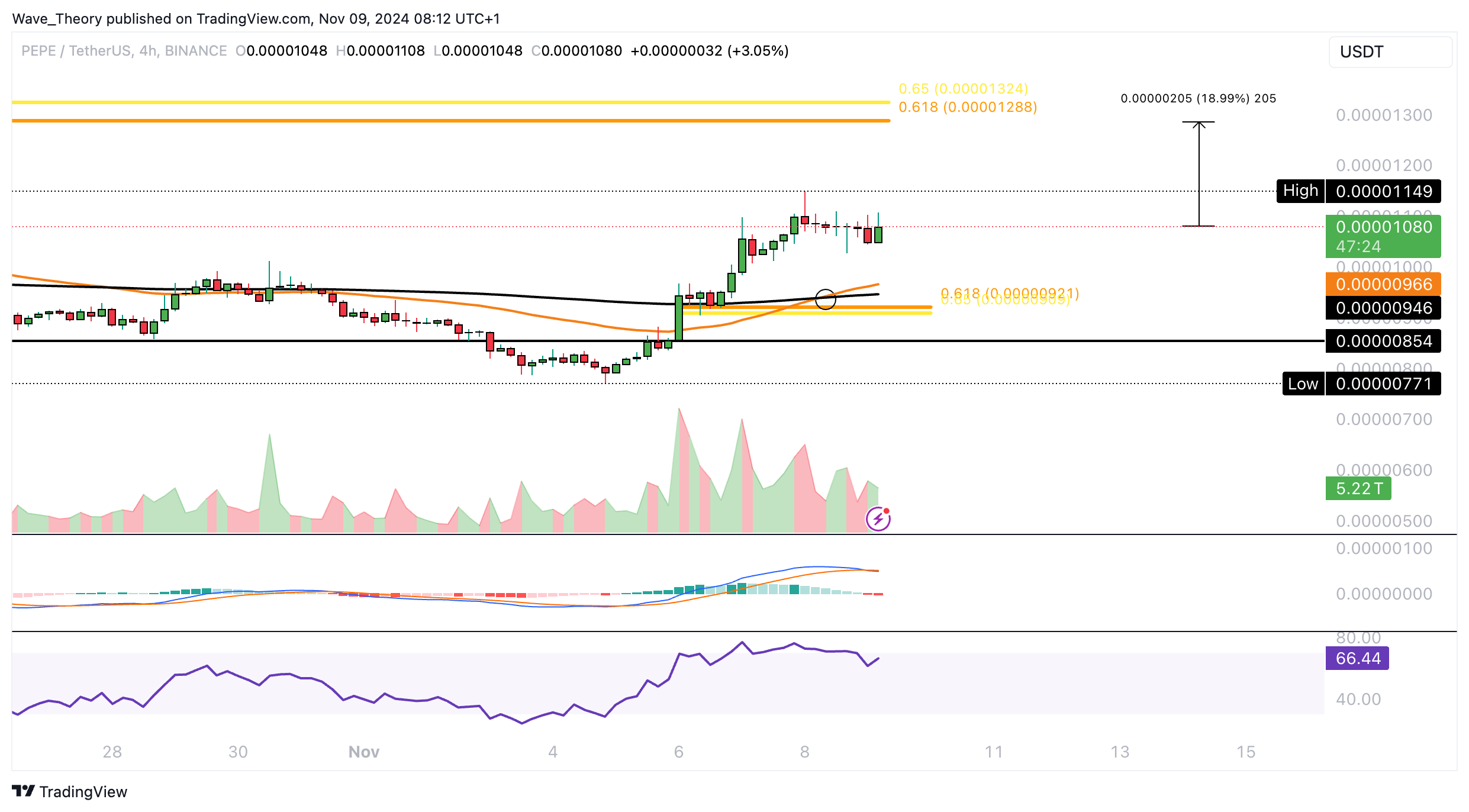 Im 4H-Chart haben die EMAs jetzt ein Golden Crossover geformt, womit der Trend kurzfristig bullisch bestätigt ist. Damit könnte es den PEPE Preis jetzt noch rund 19 % höher katapultieren.