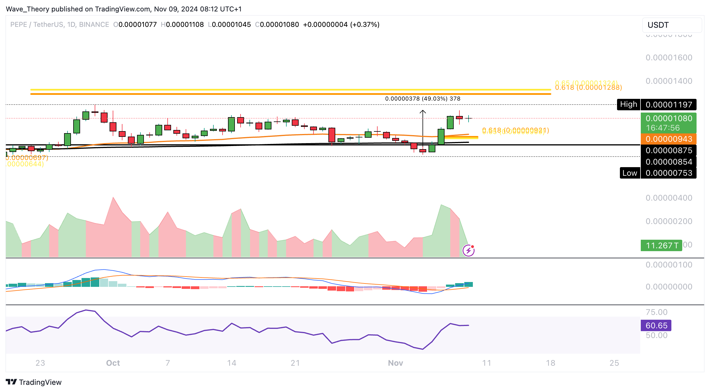Sollte PEPE den Golden Ratio Widerstand bei rund 0,0000129 USD brechen, könnte er zum letzten Hochpunkt bei rund 0,00001725 USD steigen – oder diesen womöglich sogar übersteigen..