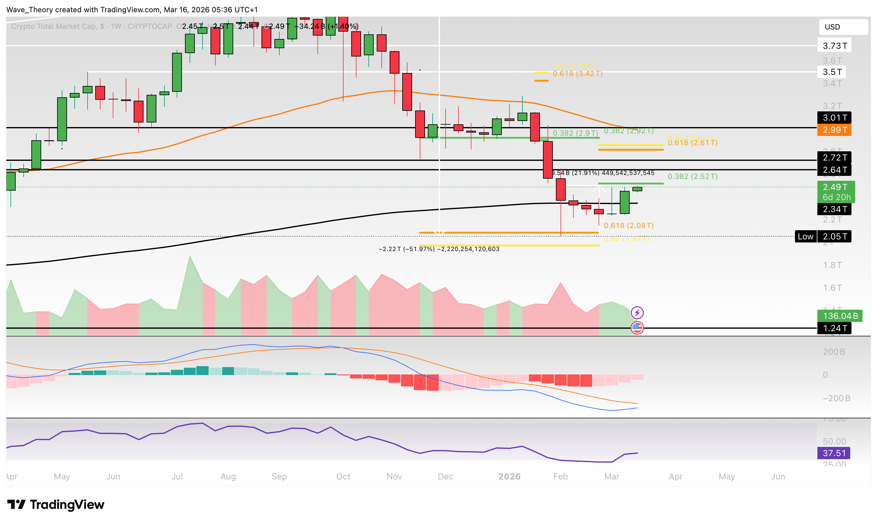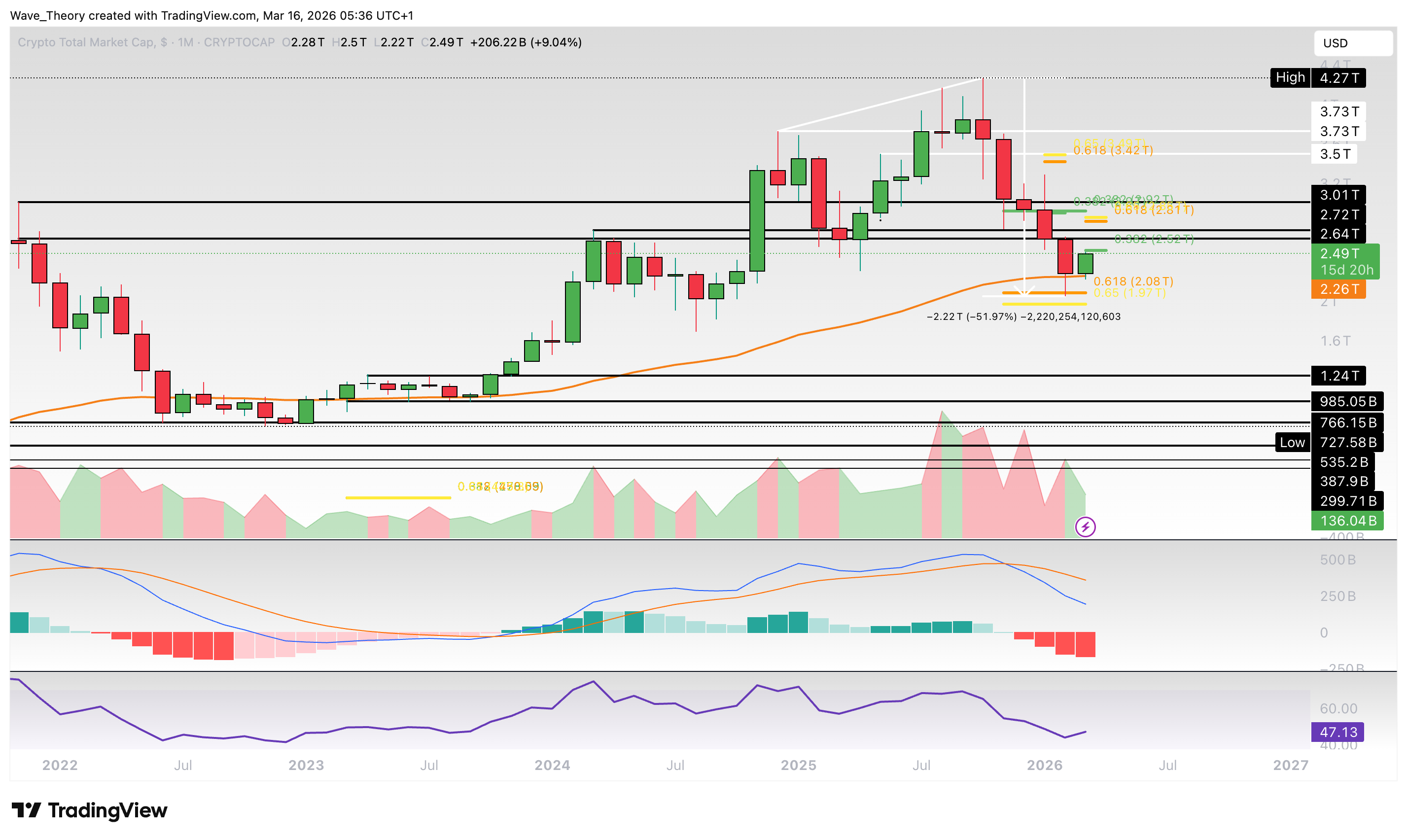 Währenddessen gibt der RSI weder bullische noch bärische Signale. Der Markt stößt jetzt am 0,382 Fib Niveau bei rund 2,52 Billionen USD auf signifikanten Wdierstand.