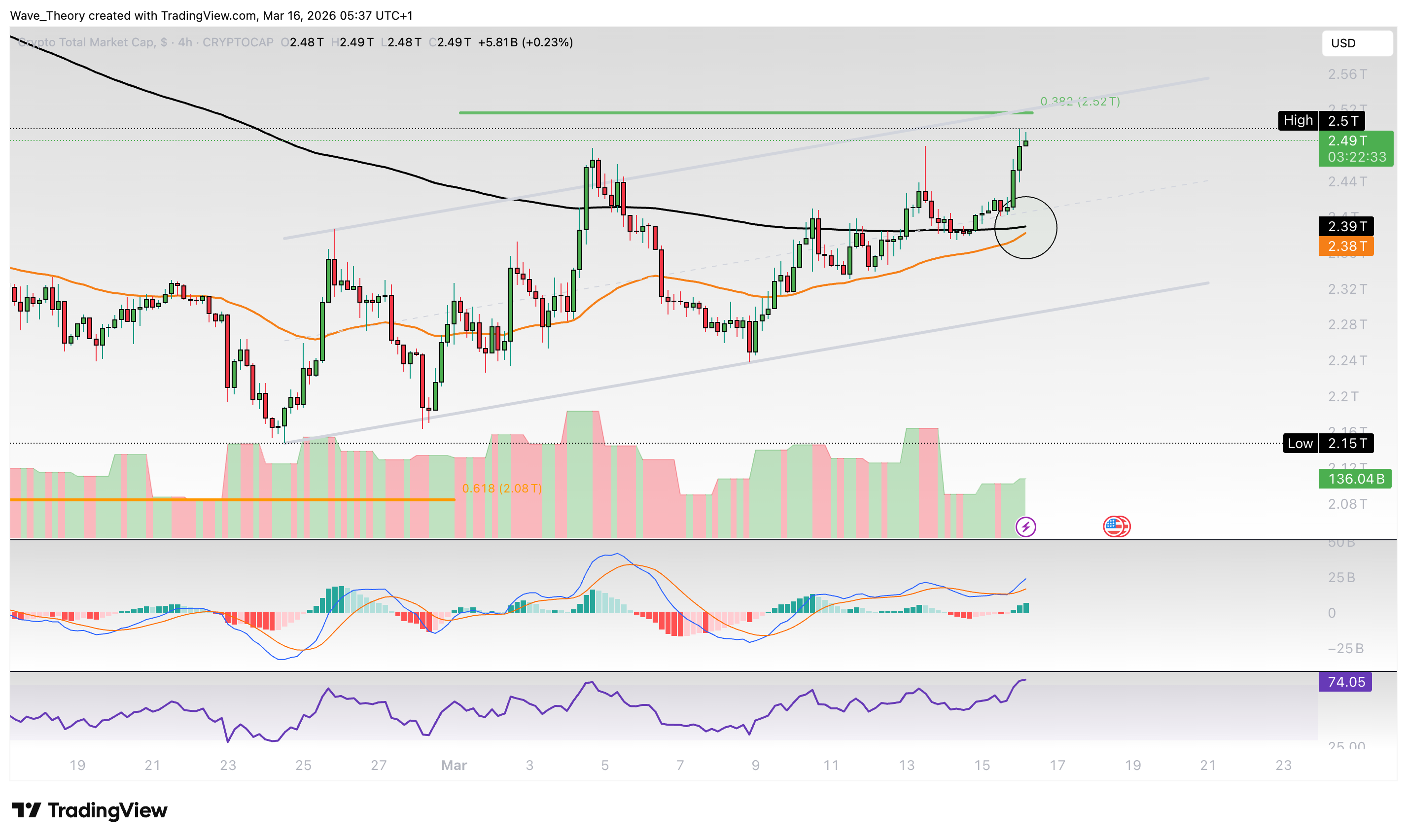 Heute scheint der Markt den 50-Tage-EMA Widerstand bei rund 2,46 Billionen USD zu überwinden. Ein Tagesschlusskurs darüber wäre sehr bullisch für den Markt.