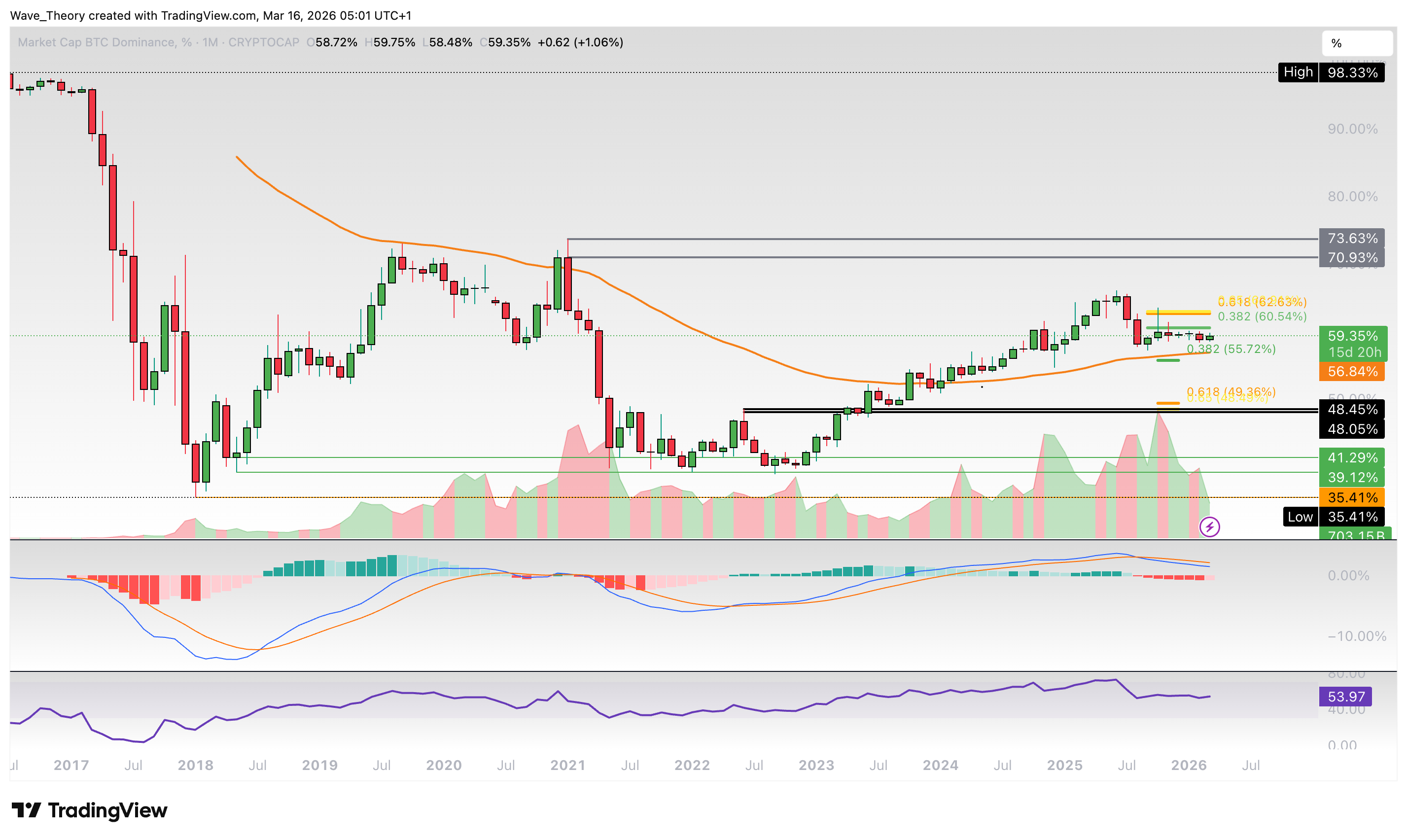 Die Bitcoin Dominanz bewegt sich seit rund sechs Monaten unter dem 0,382-Fibonacci Widerstand bei etwa 60,5 %, ohne dabei jedoch deutlich zur Unterstützung am 50-Monate-EMA bei rund 56,7 % oder zur 0,382 Fib Unterstützung bei rund 55,7 % zurückzufallen.