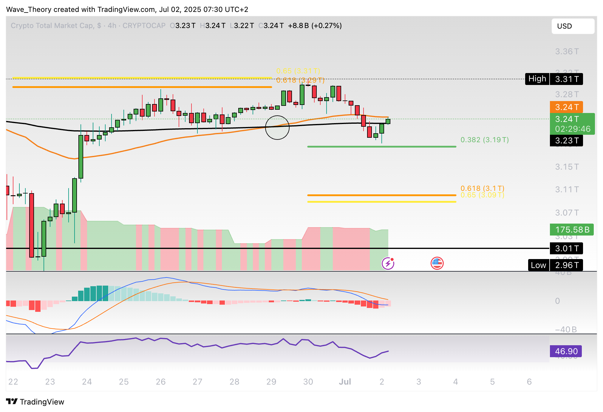 Der Markt wurde am Golden Ratio Widerstand bei rund 3,3 Billionen USD bärisch abgewiesen und ist anschließend zur 0,382 Fib Unterstützung bei rund 3,2 Billionen USD zurückgekehrt. Dort fungiert der 50-Tage-EMA als zusätzliche Unterstützung.