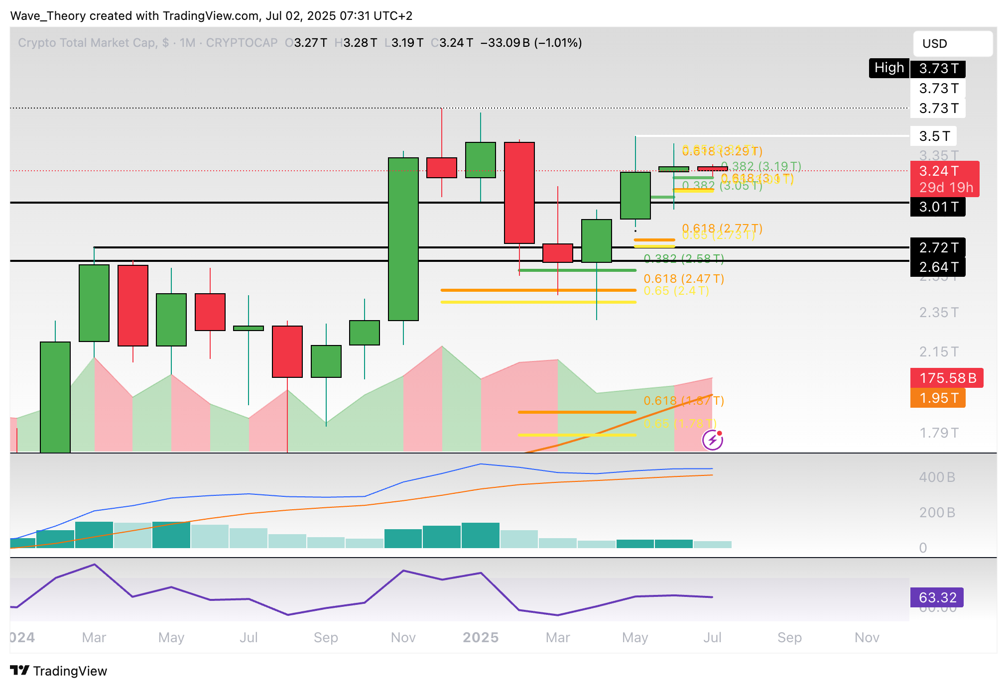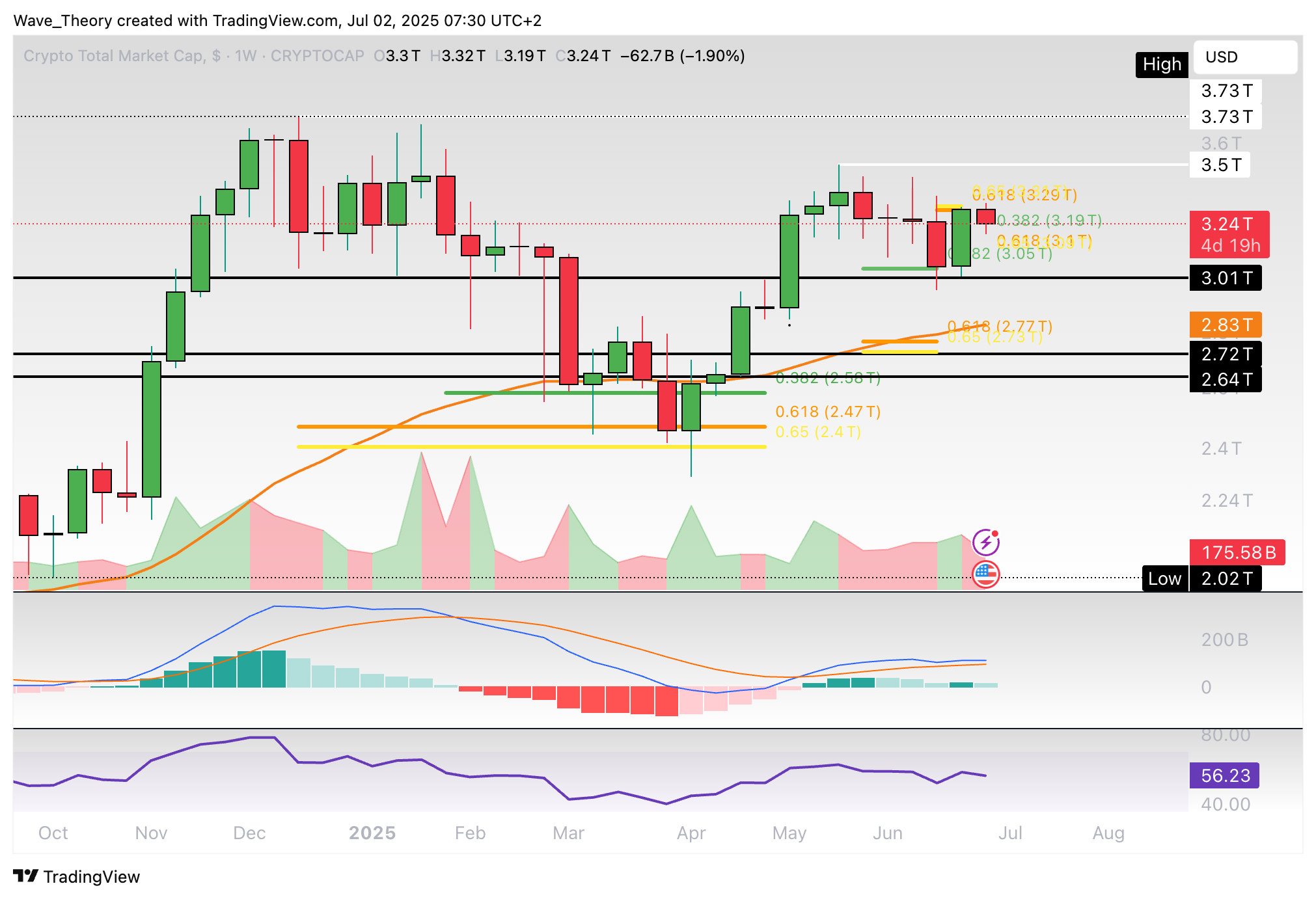 Derzeit scheint der Markt daran bullisch abzuprallen, womit er schon bald zum Golden Ratio Widerstand bei rund 3,3 Billionen USD zurückkehren könnte. Bricht er das Fib Niveau bullisch, könnte er zum letzten Hochpunkt bei rund 3,5 Billionen USD steigen.