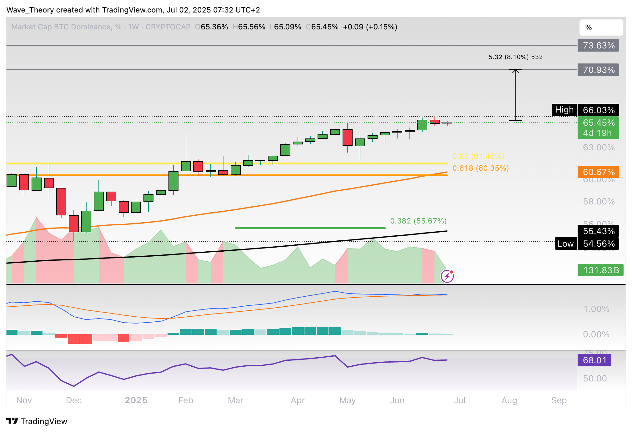 Die Bitcoin Dominanz bleibt in einem Aufwärtstrend. Es besteht jetzt noch rund 8 % Aufwärtspotenzial, bis der Kurs auf signifikanten Widerstandsbereich zwischen rund 71 % und 74 % stößt.