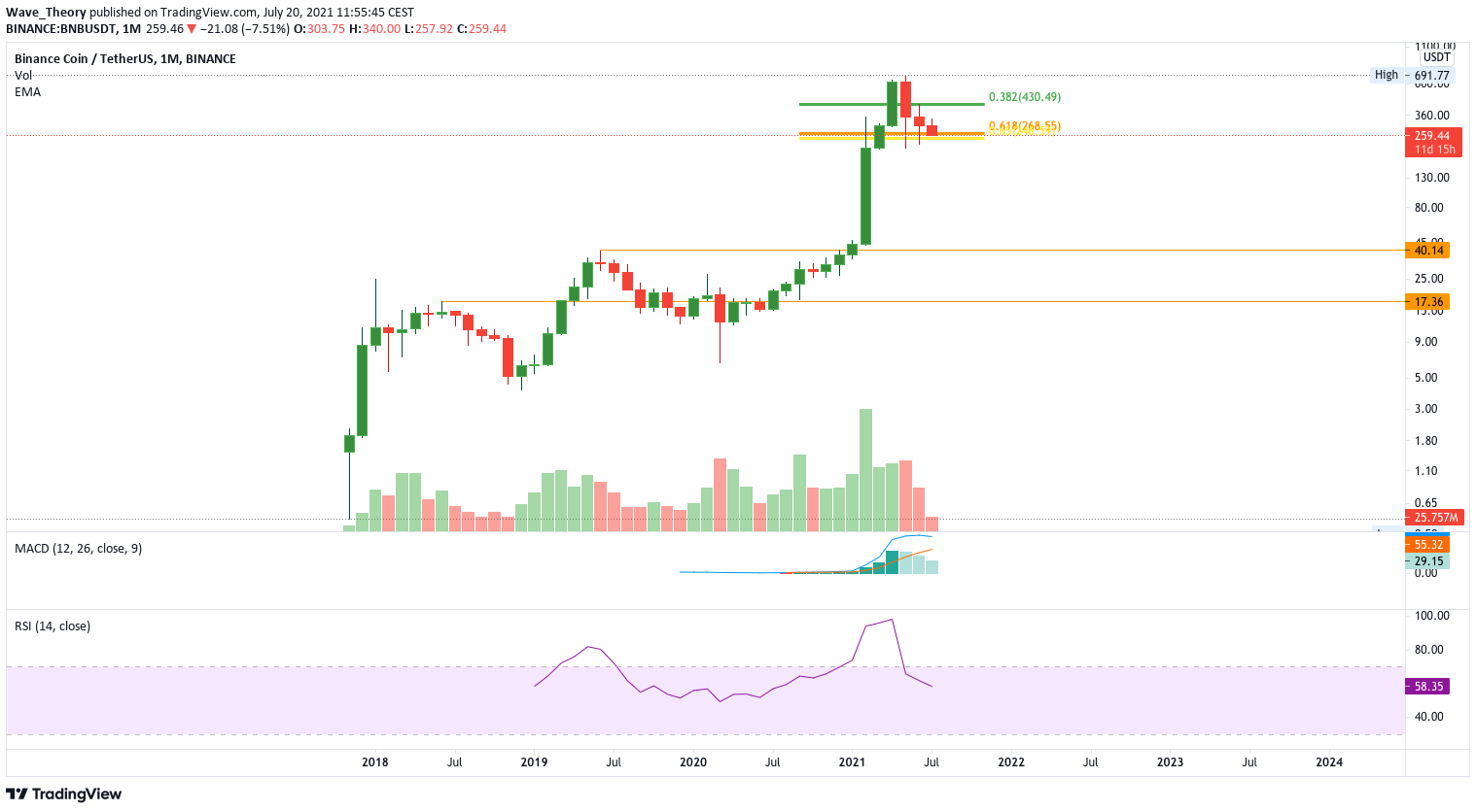 Im Monatskurs sieht es nicht sonderlich gut für den BNB Kurs aus. Binance Coin befindet sich an der Golden Ratio Unterstützung bei knapp 250 USD, und sollte dieses Niveau brechen, könnte Binance Coin bis 40 USD oder gar 17 USD fallen. Denn der rasante Anstieg der Kryptowährung zu Beginn des Jahres, gab BNB keine Chance Unterstützungslinien zu etablieren.
