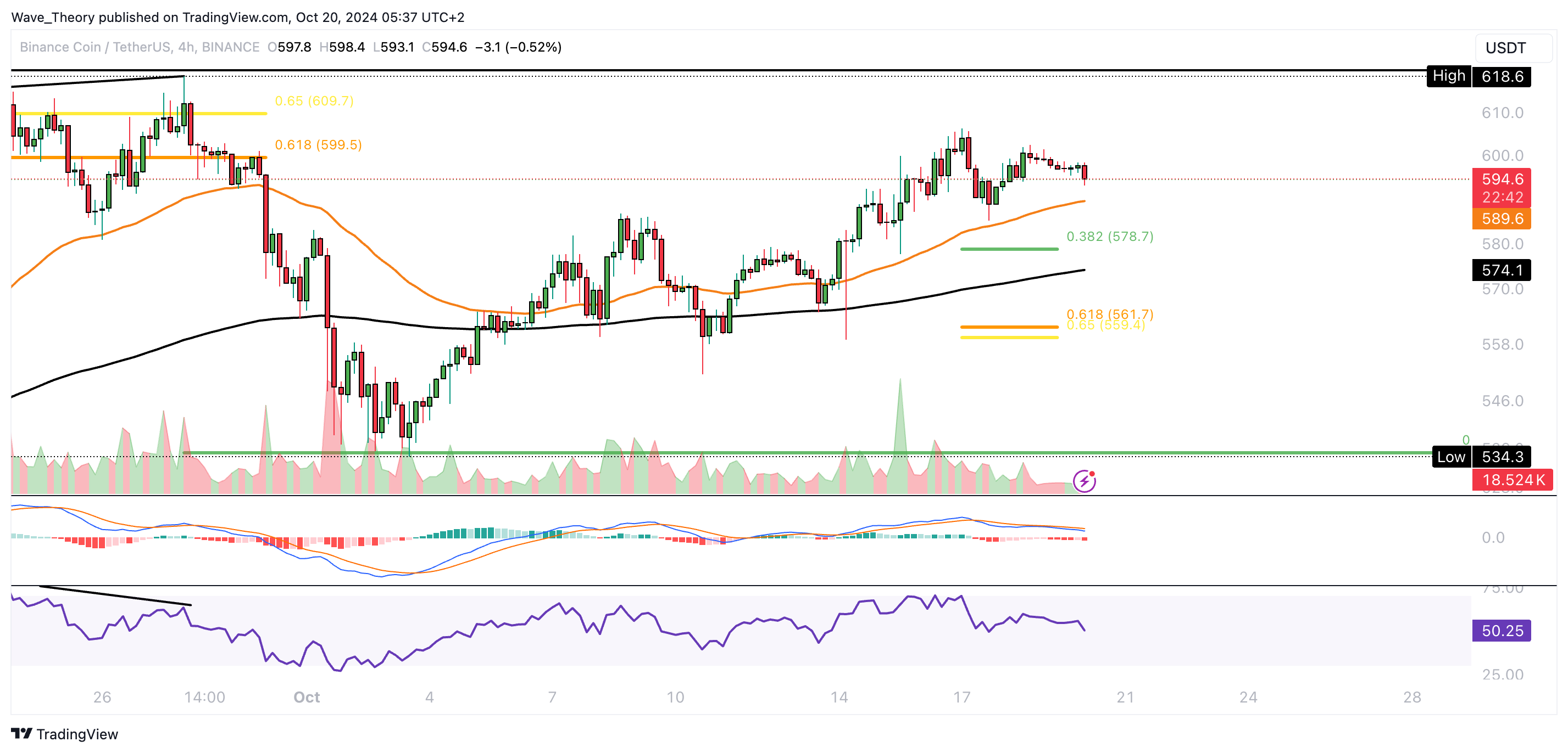 Seit der BNB Preis die 0,382 Fib Unterstützung bei rund 535 USD erreicht hat, ist der Kurs rund 13,5 % gestiegen. Doch jetzt hat BNB erneut den Golden Ratio Widerstand bei rund 600 USD erreicht.