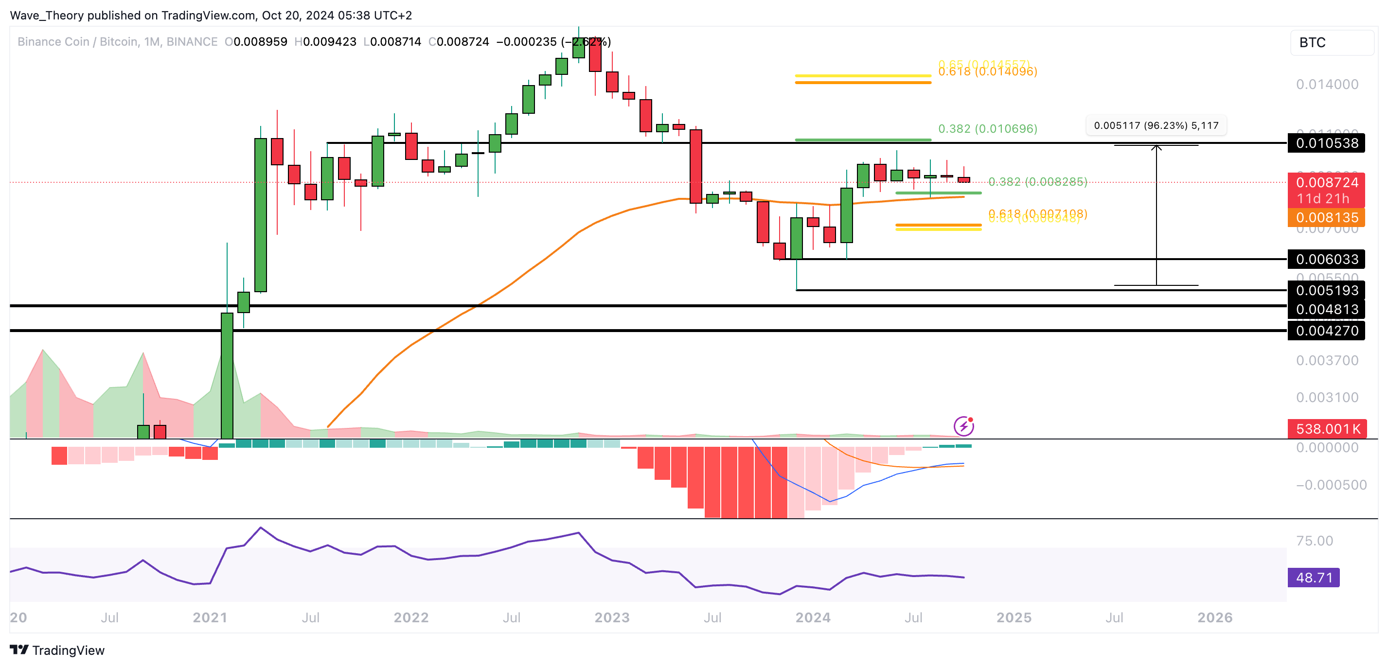 Gegen BTC stößt der BNB Kurs bald auf signifikante Unterstützung. Denn zwischen 0,008135 BTC und 0,008265 BTC stößt BNB auf den 50-Monate-EMA und das wichtige 0,382 Fib Niveau.