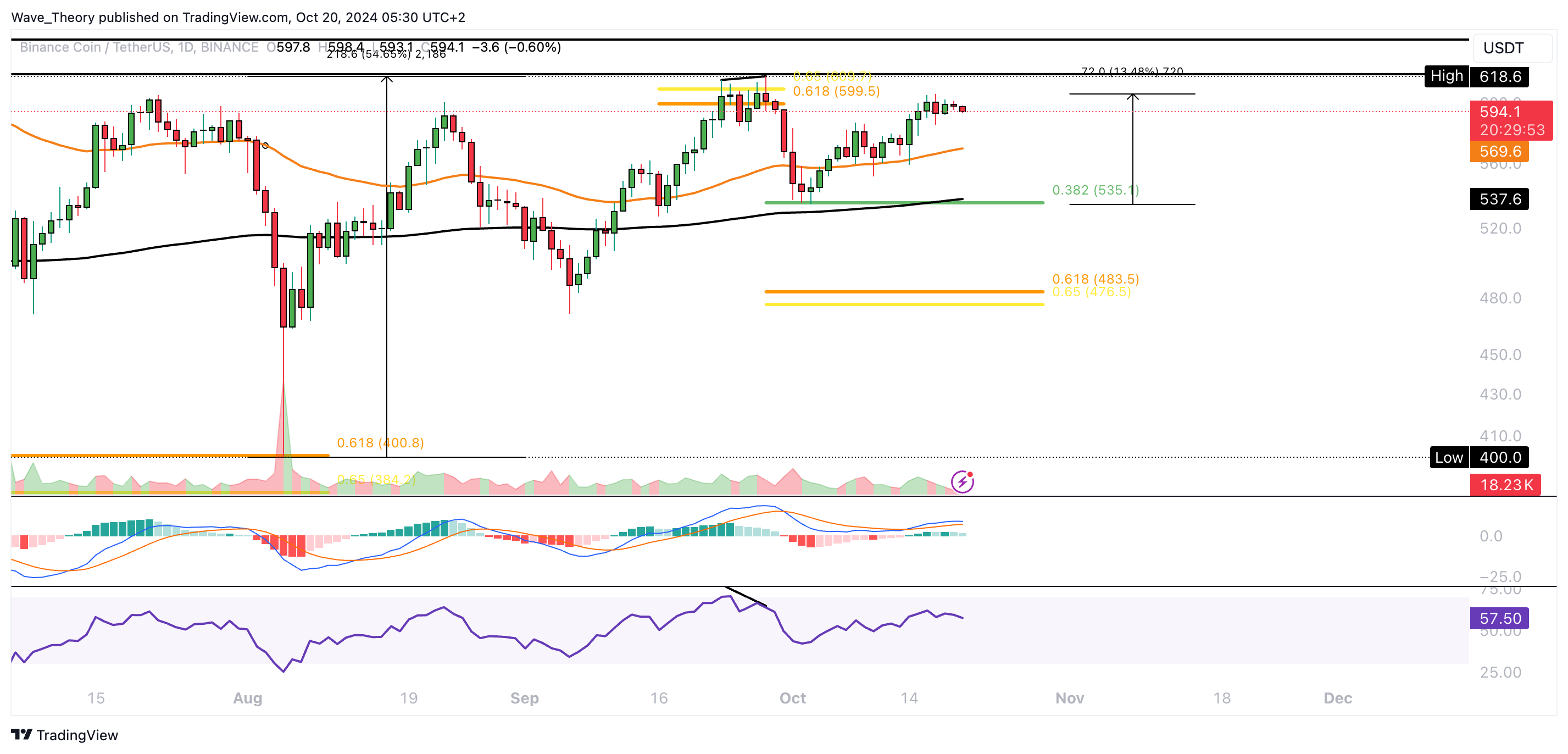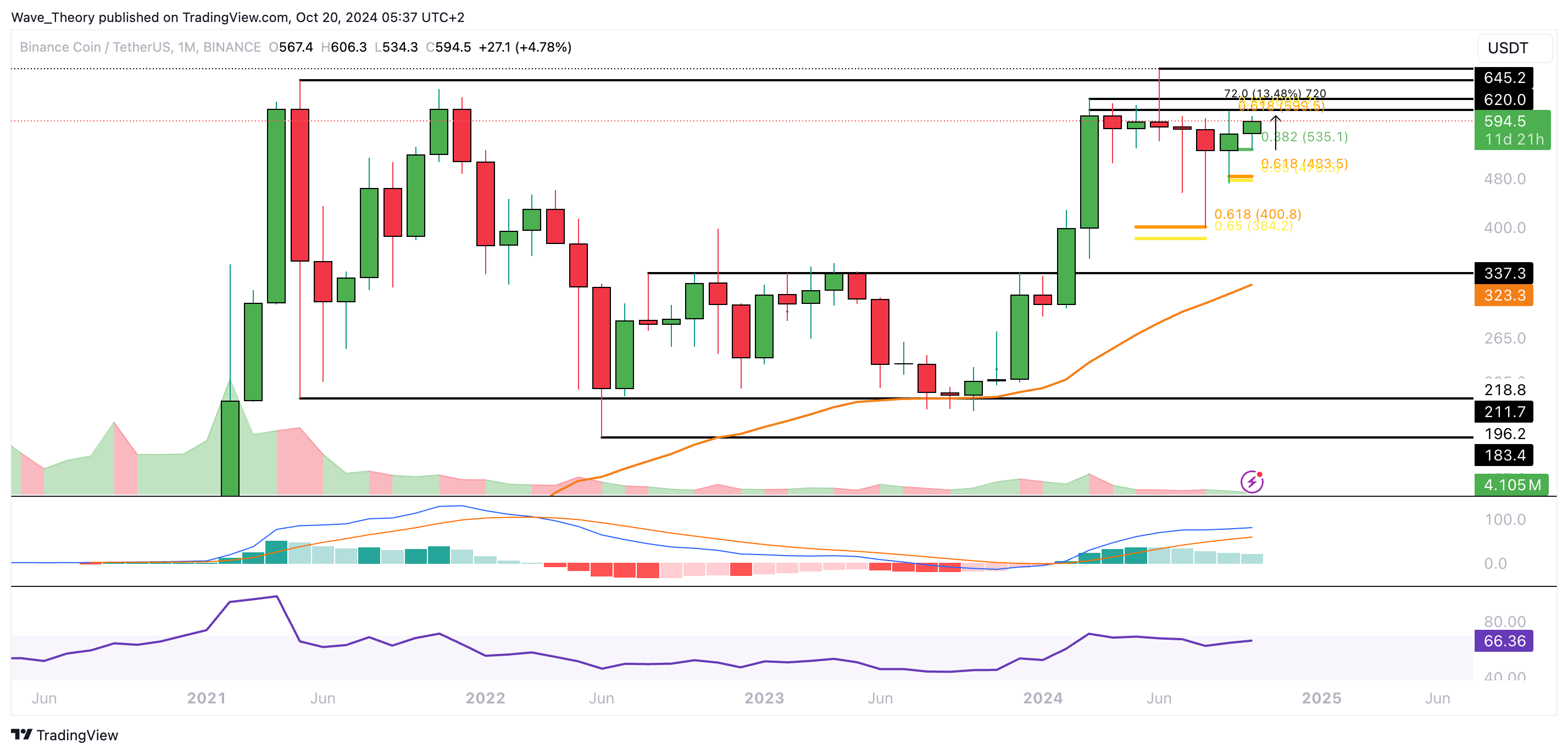Bricht BNB den Golden Ratio Widerstand bei rund 600 USD, könnte BNB das Allzeithoch bei rund 722 USD anvisieren.
