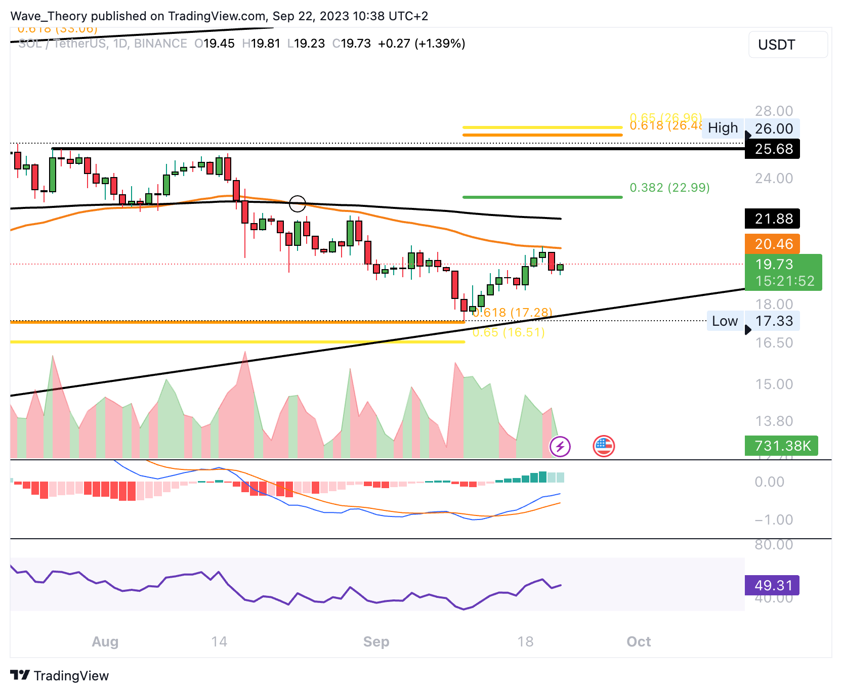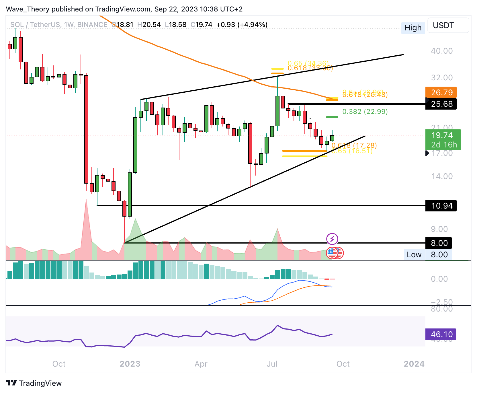 Bricht Solana auch den 0,382 Fib Widerstand bei rund 23 USD, könnte der Kurs sogar bis zur Golden Ratio am 50-Wochen-EMA Bei rund 26,5 USD steigen. Davon abgesehen sind die MACD Linien im Wochenchart aber bärisch überkreuzt, während sich der RSI neutral zeigt. Das Histogramm des MACDs tickt dabei aber in dieser Woche wieder bullisch höher.