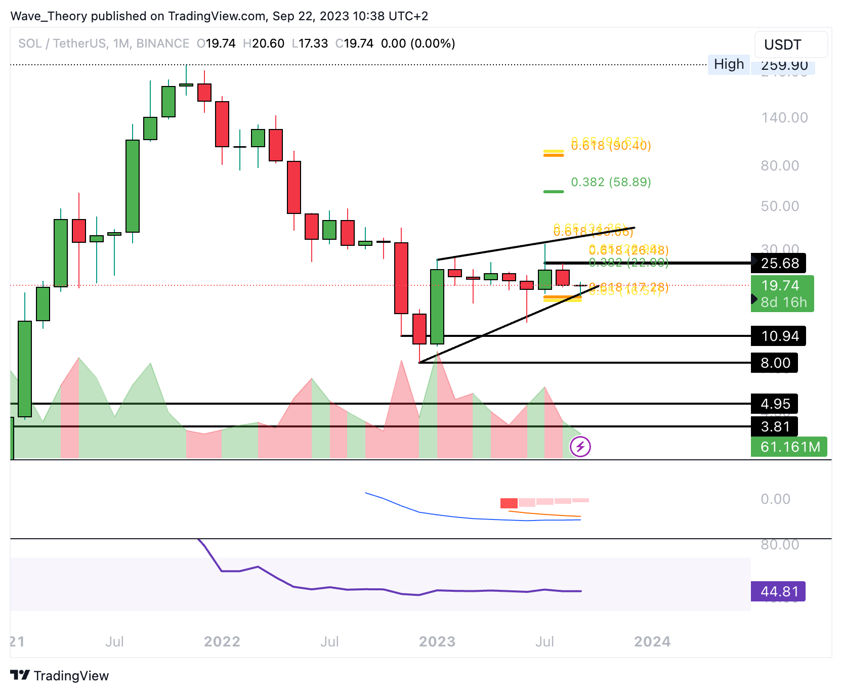 Wenn der SOL Kurs die Golden Ratio Unterstützung bei rund 17 USD bärisch bricht, könnte der Solana Kurs zur horizontalen Unterstützung zwischen rund 8 USD und 11 USD zurückkehren. Jedoch weist das Histogramm des MACDs im Monatschart immer noch einen bullischen Trend auf. Auch die MACD Linien könnten sich damit schon bald bullisch überkreuzen. Der RSI gibt dabei keine eindeutigen Signale, sondern bewegt sich in neutralem Territorium.