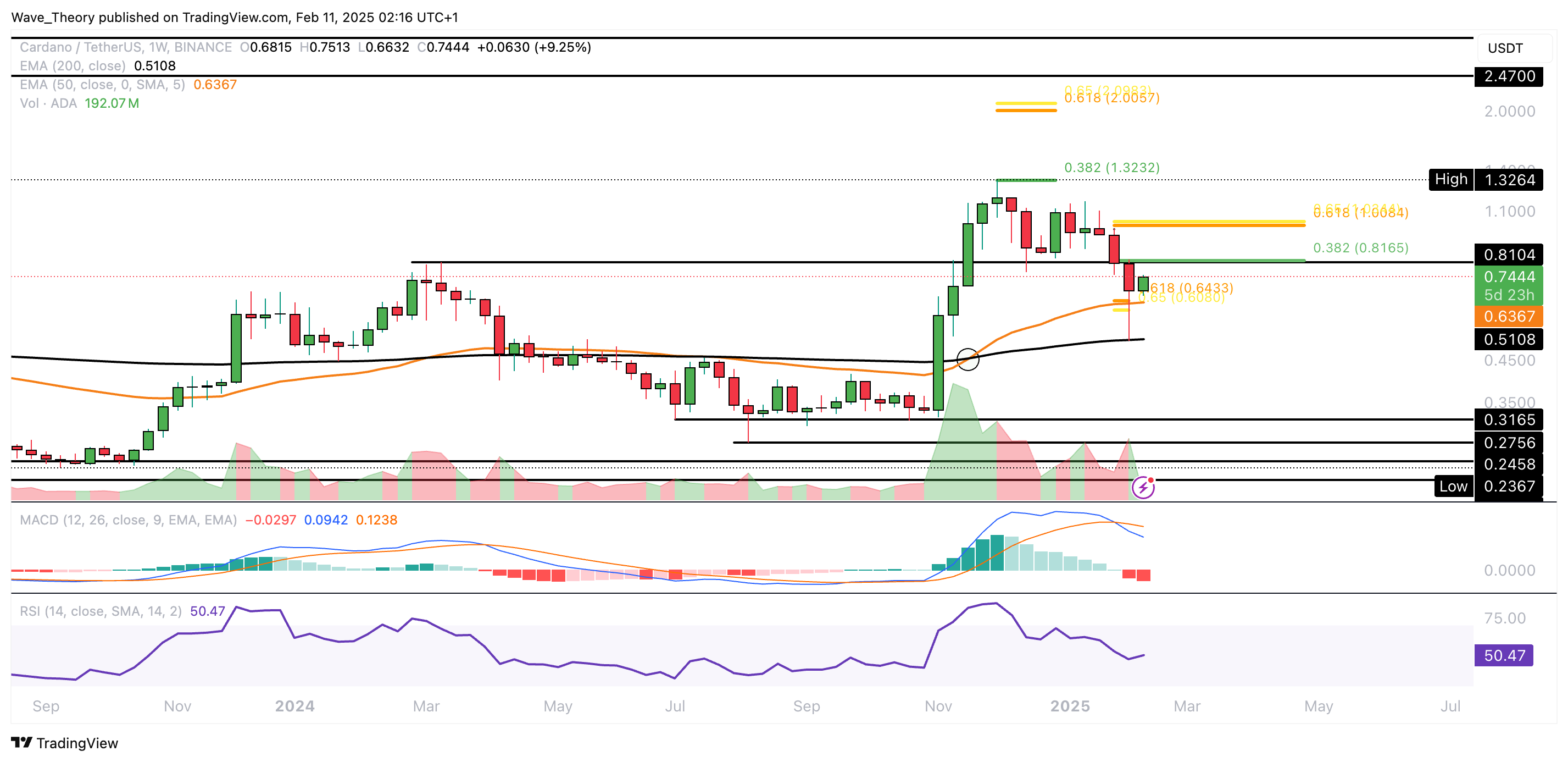 In derselben Woche ist der Kurs sogar noch über der Golden Ratio Unterstützung am 50-Wochen-EMA bei rund 0,64 USD geschlossen. Damit warten jetzt bei rund 0,8165 USD und bei rund 1,05 USD die nächsten signifikanten Fibonacci Widerstände.