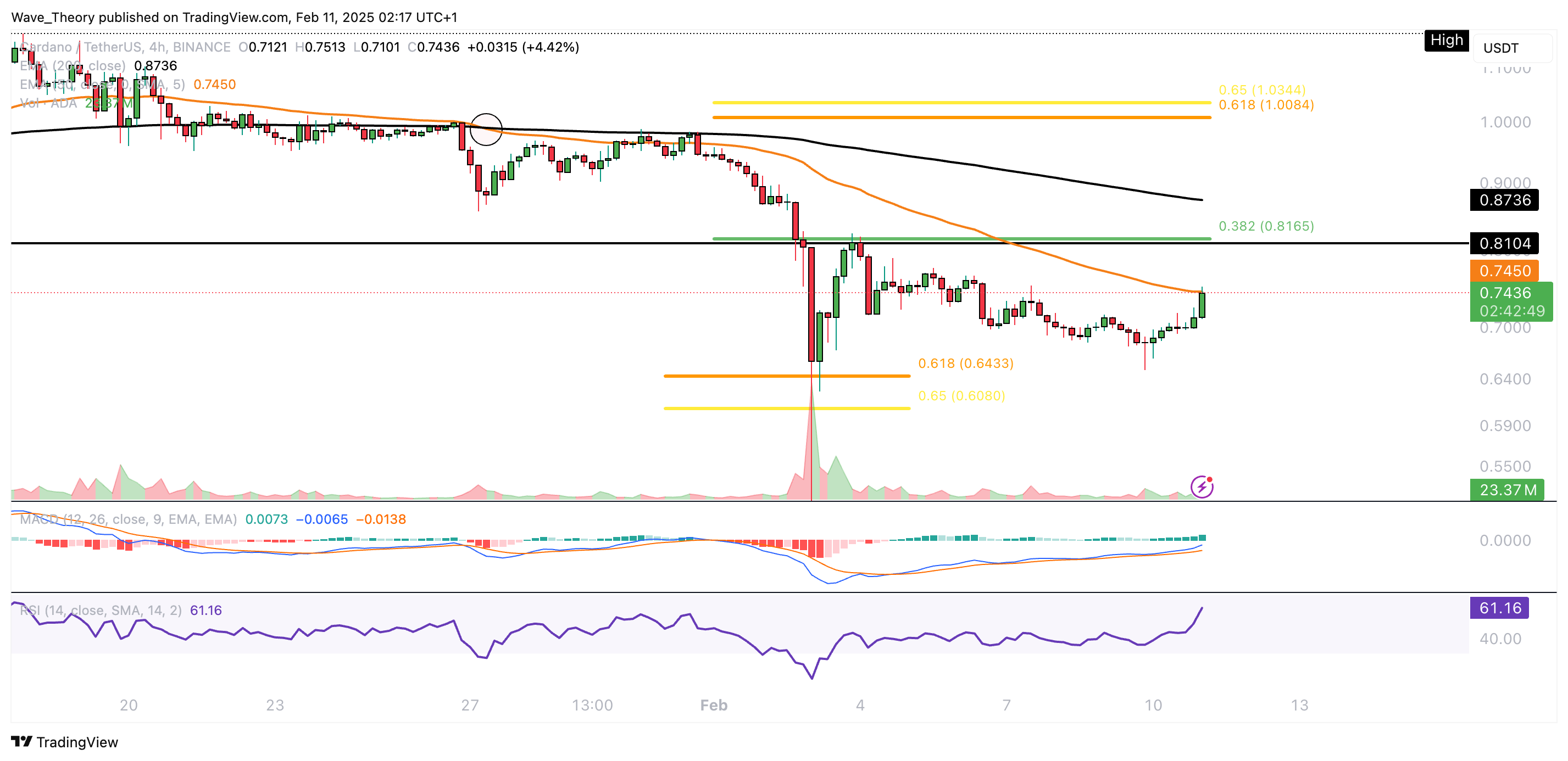 Kurzfristig besteht noch mehr Aufwärtspotenzial für den ADA Kurs. So scheint Cardano heute den 200-Tage-EMA Widerstand bei rund 0,723 USD zu überwinden, womit der Kurs zum 0,382 Fib Niveau bei rund 0,8165 USD steigen könnte.