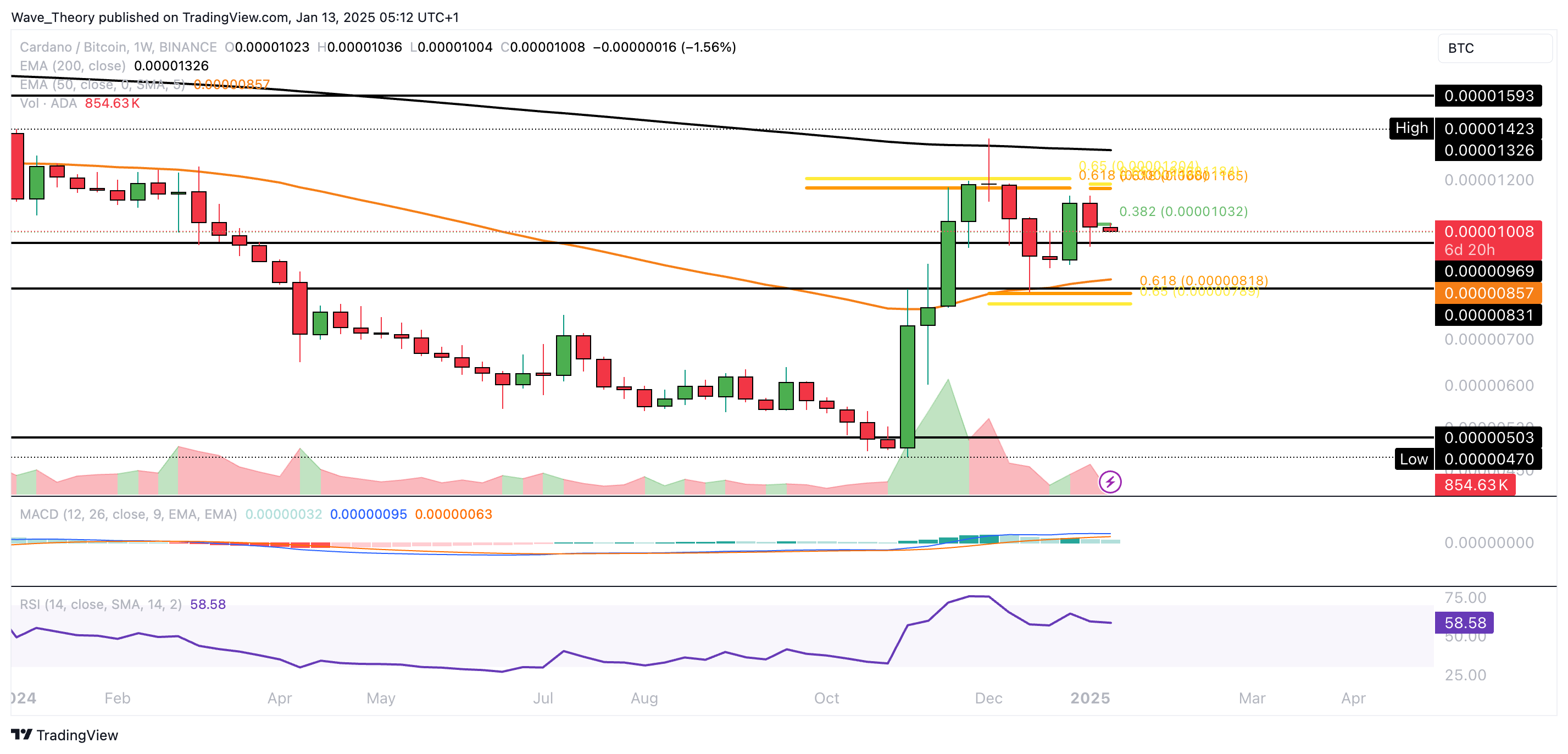 Dort konnte Cardano bullisch abprallen. Jedoch konnte Cardano den Golden Ratio Widerstand bei rund 0,00001165 BTC wieder nicht überwinden.