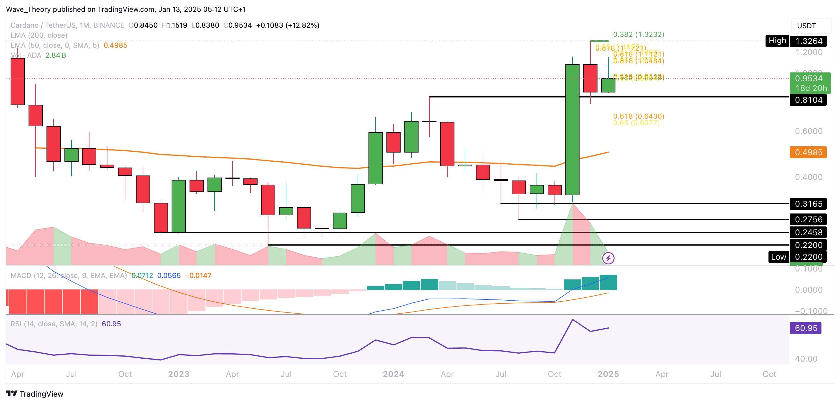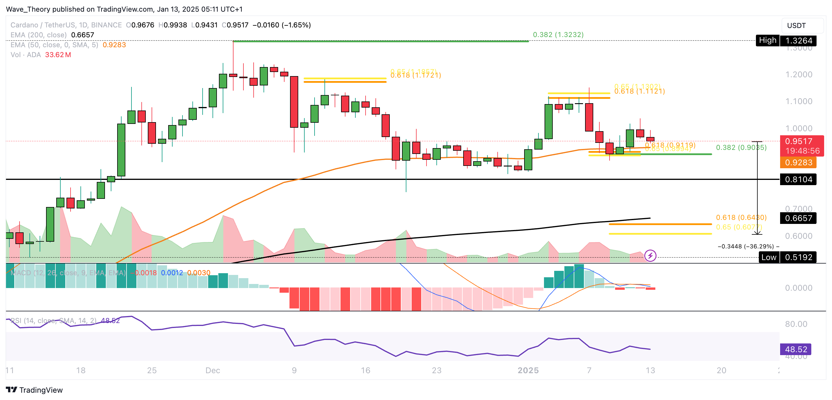Dort liegt zudem ein wichtiges 0,382 Fib Niveau und der 50-Tage-EMA. Wenn Cardano diese Unterstützung bärisch bricht, könnte Cardano um weitere 36,3 % fallen, um die Golden Ratio bei rund 0,64 USD zu erreichen.