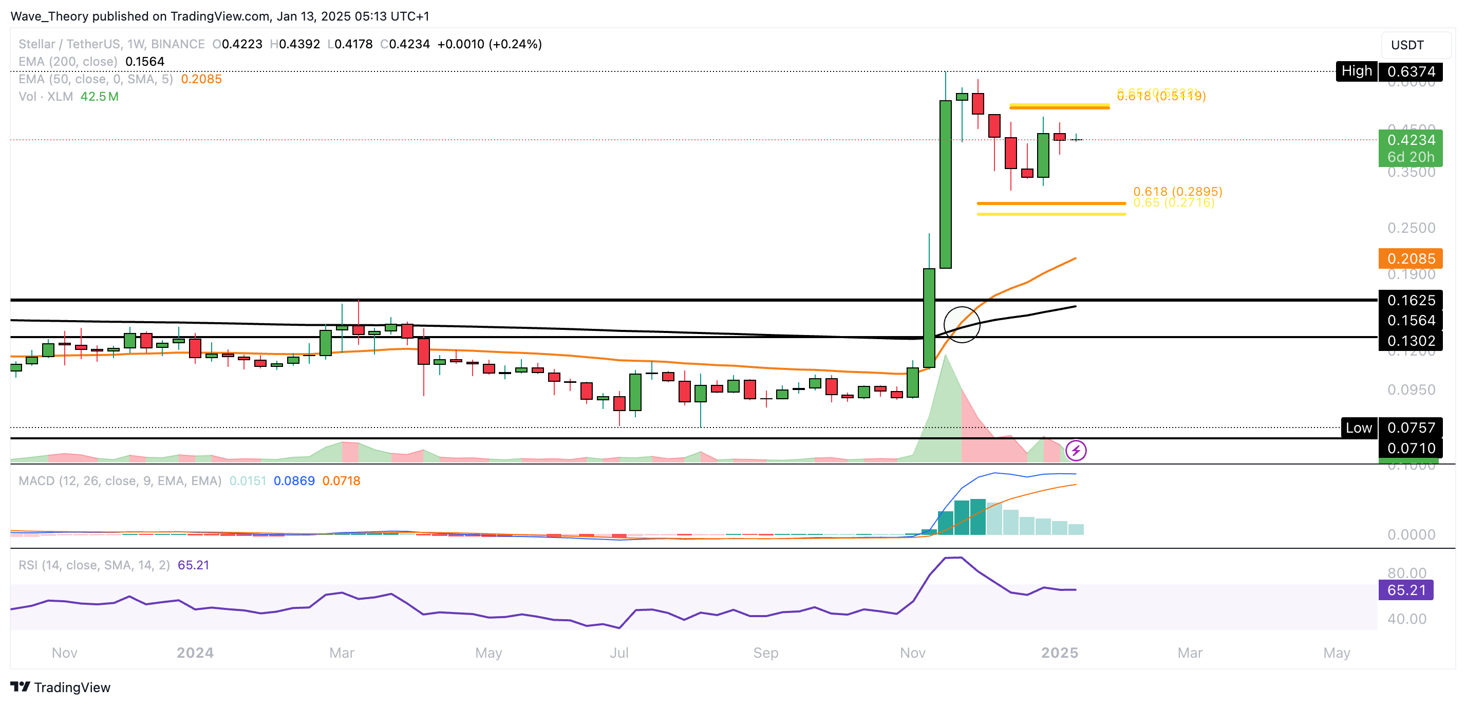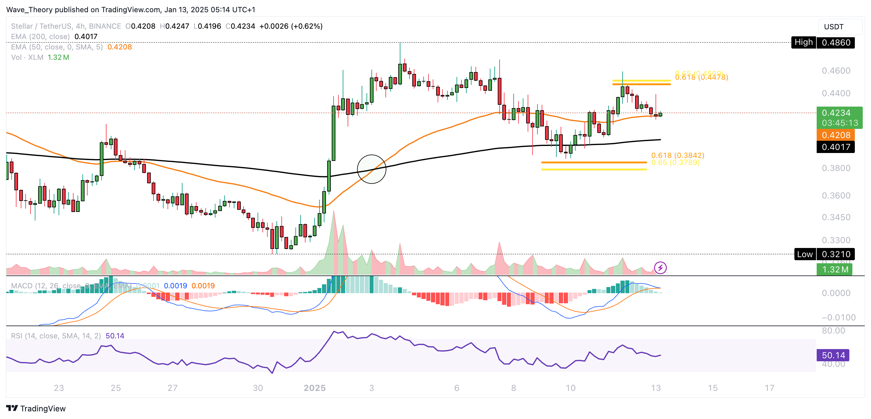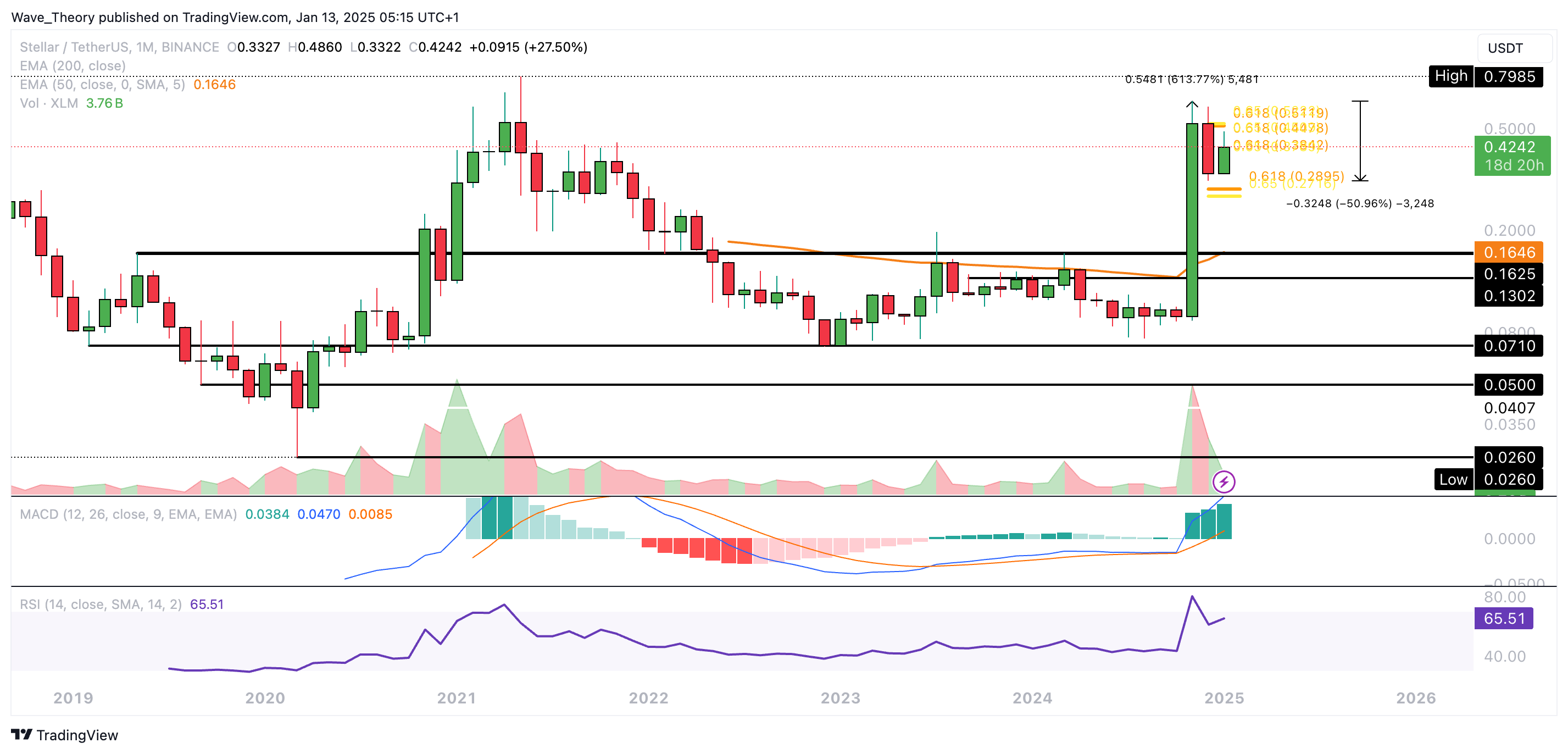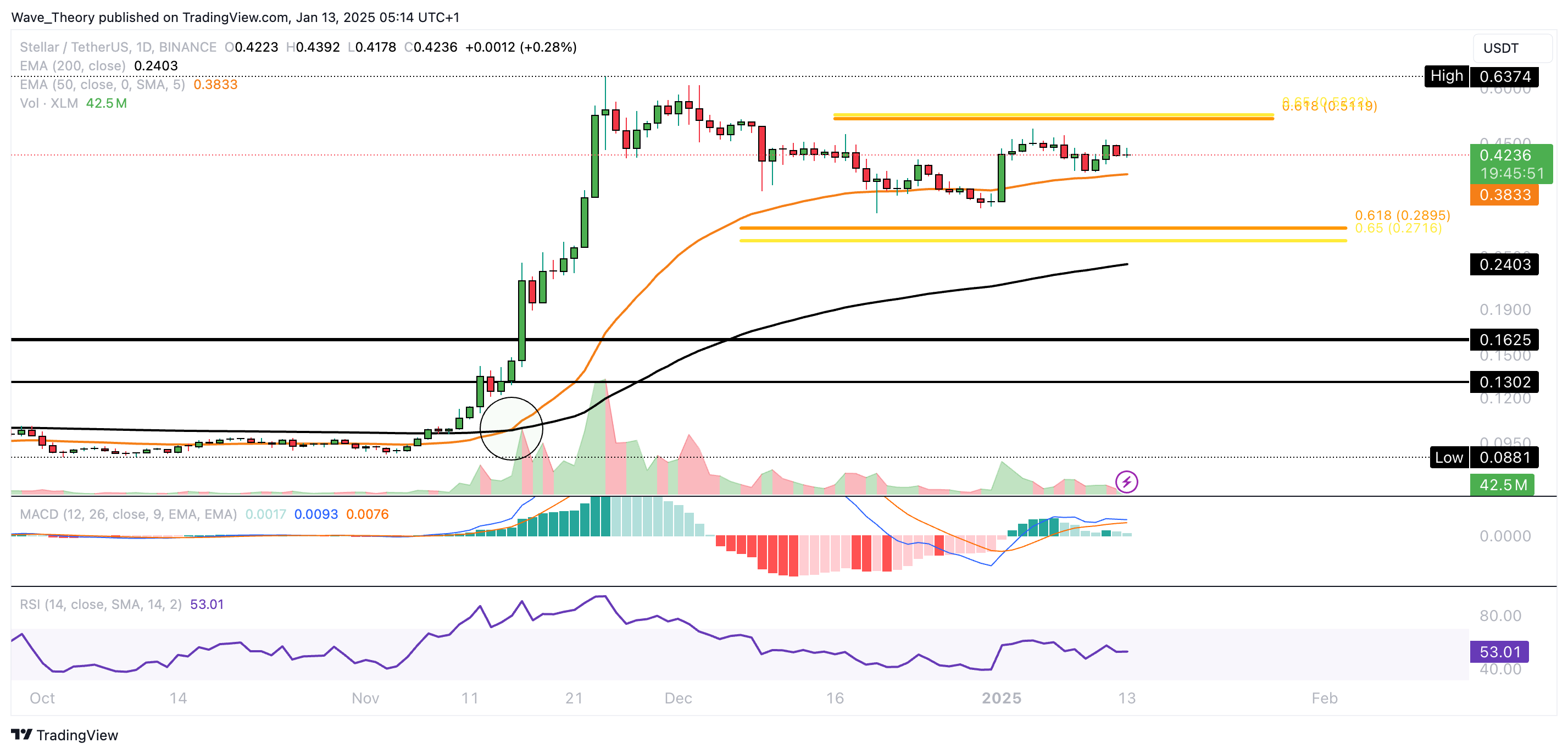 Der Stellar Kurs könnte zur Golden Ratio Unterstützung bei rund 0,29 USD korrigieren oder zum Golden Ratio Widerstand bei rund 0,515 USD steigen.