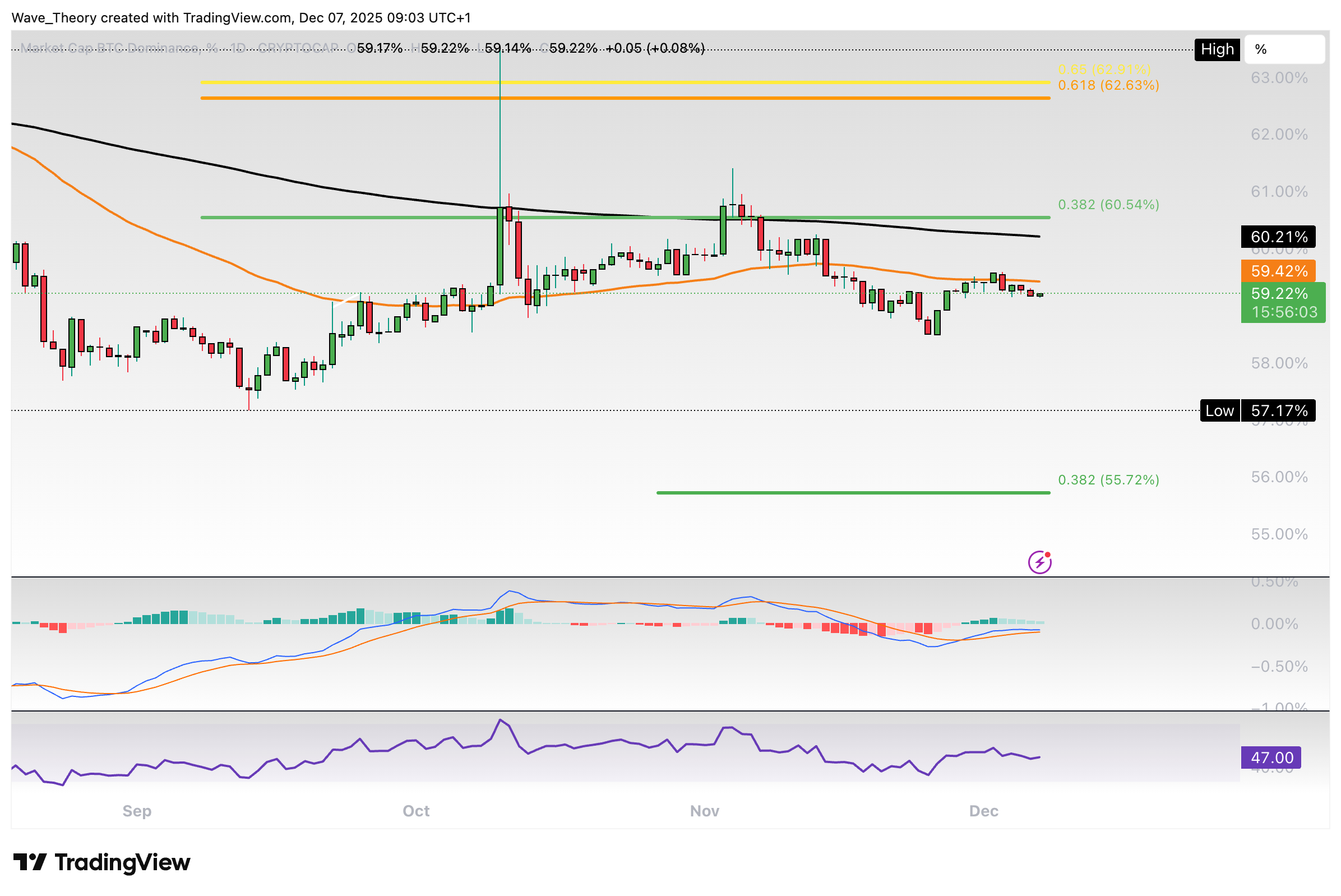 Anschließend wurde sie am 0,382 Fib Niveau bei rund 60,5 % bärisch abgewiesen. Jetzt scheint die BTC Dominanz am 50-Tage-EMA bei rund 59,4 % auf bärische Ablehnung zu stoßen.