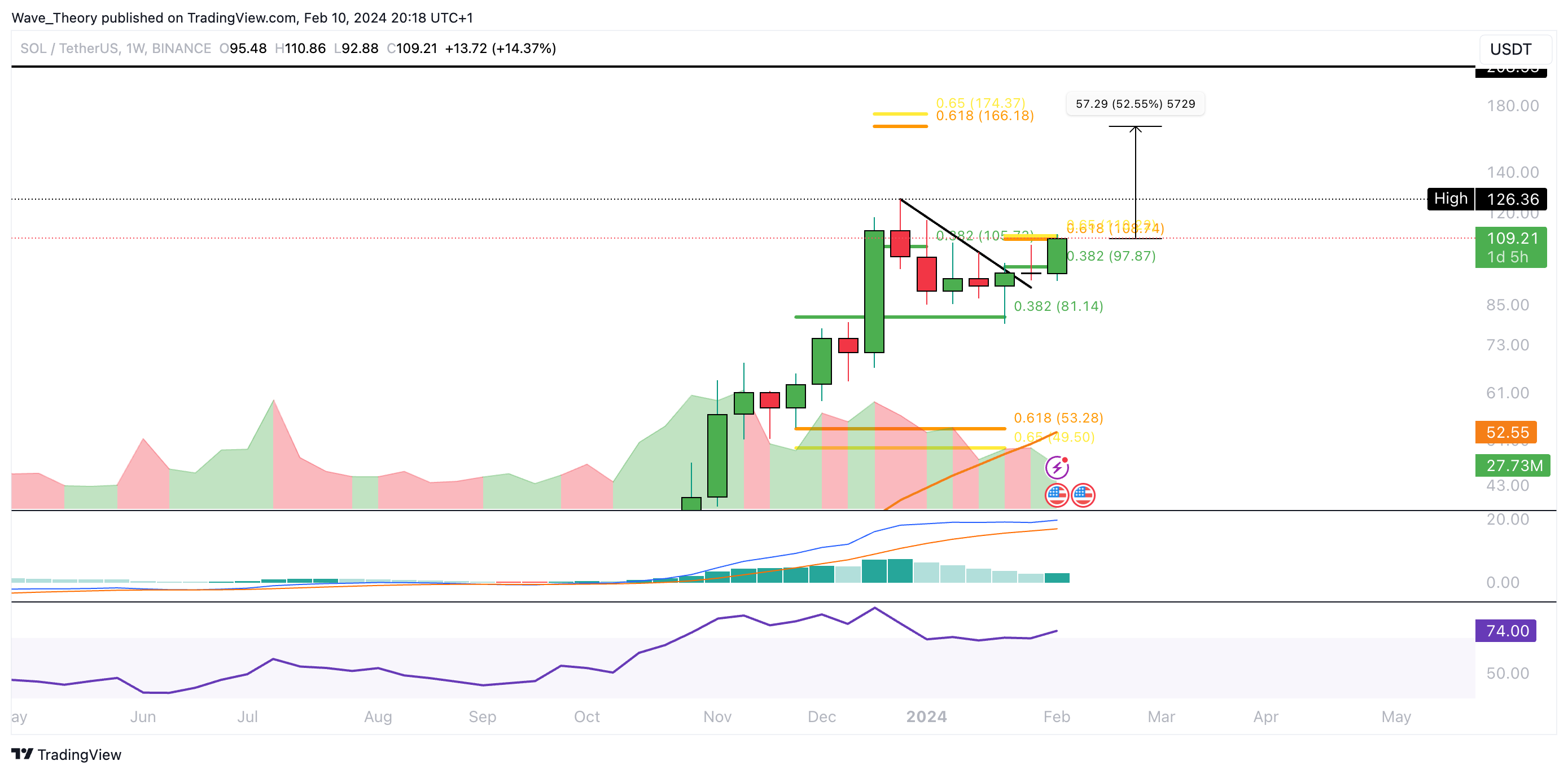 Mittelfristig könnte der Solana Kurs um rund 53 % steigen, wenn er den Golden Ratio Widerstand bei rund 110 USD bricht. Dafür muss Solana zunächst den letzten Hochpunkt bei rund 126 USD hinter sich lassen.